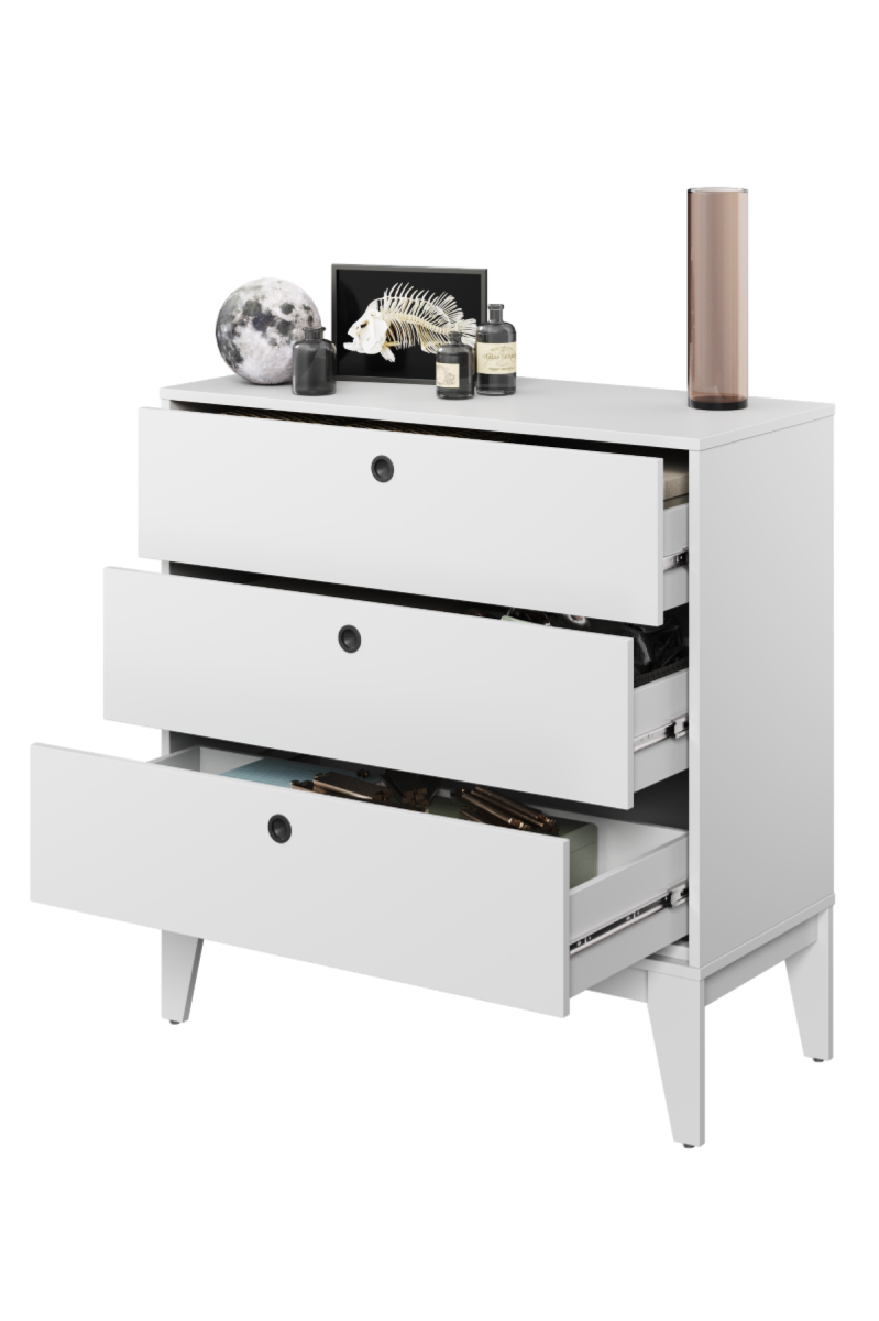FALIN je komoda s troma zásuvkami v nadčasovej snehobielej farbe so dizajnovými štíhlymi nohami a oblými rukoväťami čiernej farby. Priestranné zásuvky poskytujú bohatý úložný priestor. Nábytok bol navrhnutý pre deti i dospelých, ktorí majú radi interiéry v jednoduchom štýle.Komoda disponuje hranami ABS a je vyrobená z kvalitnej LTD dosky.Farebné prevedenie alpská biela. Dodávame v demonte.Rozmery (š,v,h) 92x95x40