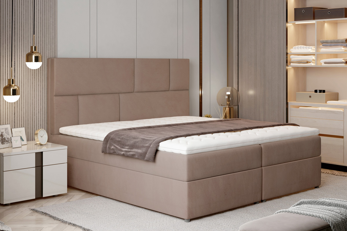 Posteľ FANCY patrí medzi boxspringové postele. Najvýraznejším prvkom je vyvýšené čelo postele, ktoré poskytne pohodlnú opierku hravy a ochráni stenu pred oderom. Jednoduché prešívanie vytvára jemný obdĺžnikový vzor, ktorý sa stane ozdobou Vašej spálne. Jednofarebné prevedenie dáva možnosť variabilnej kombinácie s ďalším nábytkom či farbami. Výška ložnej plochy poskytne pohodlné vstávanie a sadanie na posteľ. Moderný dizajn postele je prepojený s praktickým riešením priestoru. Posteľ ponúka spaciu plochu 165 x 200 cm, členenú na dve časti. Pod každou z nich nájdete úložné boxy. Využívajú UP systém otvárania, vďaka ktorému sa jednoduchým spôsobom dostanete ku predmetom uloženým v boxoch.Jednostranný matrac je z bonellovej pružiny, kombinovaný s PUR penou T25. Pre ešte lepší pocit je súčasťou postele horný topper s výškou 4 cm. Poťah je hypoalergénny, snímateľný a prateľný pri 40 ℃. Posteľ je celočalúnená kvalitnou látkou Monolith 09.Rozmery (š/v/h): 165 x 124 x 210 cm. Výška ložnej plochy je 54 cm. Hrúbka zadného čela je 10 cm. Výška nožičiek je 3 cm. Posteľ sa predáva kompletná, nie je potrebné doobjednávať rošt ani matrac. Tvrdosť matraca: H3.V našej ponuke nájdete aj ďalšie rozmery a farebné prevedenia tejto unikátnej postele.