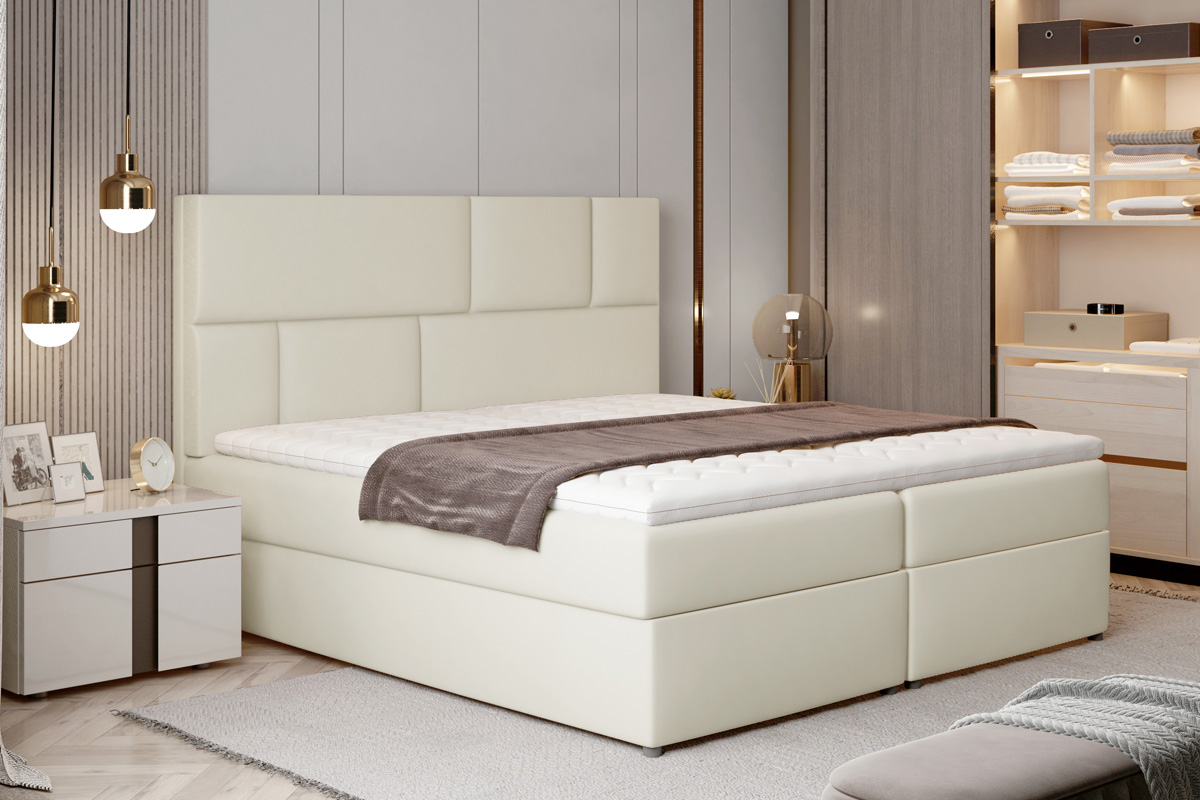 Posteľ FANCY patrí medzi boxspringové postele. Najvýraznejším prvkom je vyvýšené čelo postele, ktoré poskytne pohodlnú opierku hravy a ochráni stenu pred oderom. Jednoduché prešívanie vytvára jemný obdĺžnikový vzor, ktorý sa stane ozdobou Vašej spálne. Jednofarebné prevedenie dáva možnosť variabilnej kombinácie s ďalším nábytkom či farbami. Výška ložnej plochy poskytne pohodlné vstávanie a sadanie na posteľ. Moderný dizajn postele je prepojený s praktickým riešením priestoru. Posteľ ponúka spaciu plochu 145 x 200 cm, členenú na dve časti. Pod každou z nich nájdete úložné boxy. Využívajú UP systém otvárania, vďaka ktorému sa jednoduchým spôsobom dostanete ku predmetom uloženým v boxoch.Jednostranný matrac je z bonellovej pružiny, kombinovaný s PUR penou T25. Pre ešte lepší pocit je súčasťou postele horný topper s výškou 4 cm. Poťah je hypoalergénny, snímateľný a prateľný pri 40 ℃. Posteľ je celočalúnená kvalitnou eko-kožou Soft 33.Rozmery (š/v/h): 145 x 124 x 210 cm. Výška ložnej plochy je 54 cm. Hrúbka zadného čela je 10 cm. Výška nožičiek je 3 cm. Posteľ sa predáva kompletná, nie je potrebné doobjednávať rošt ani matrac. Tvrdosť matraca: H3.V našej ponuke nájdete aj ďalšie rozmery a farebné prevedenia tejto unikátnej postele.