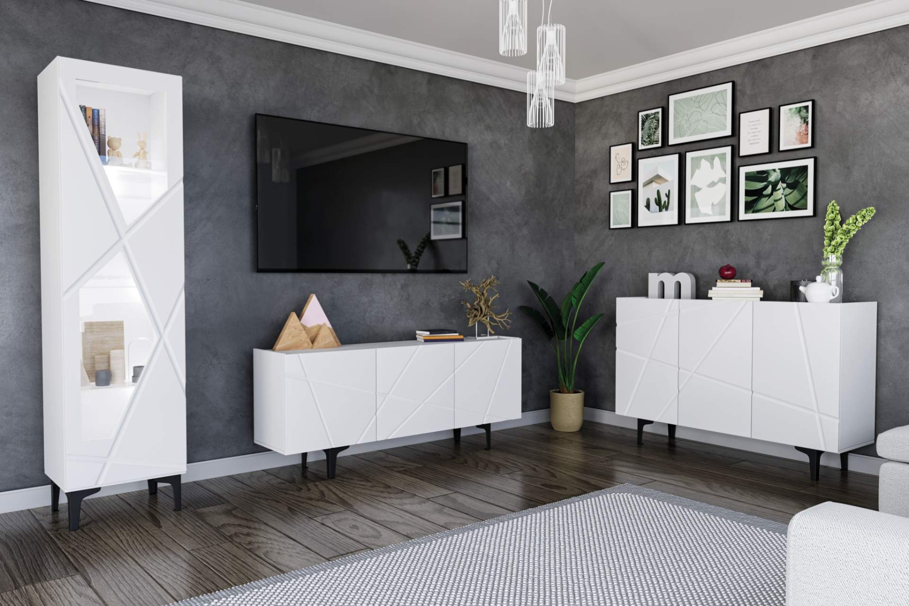 Štýlová obývacia zostava FANCY s elegantným a moderným dizajnom je navrhnutá tak, aby bola dekoratívnym a funkčným doplnkom vašej domácnosti. Patrí do exluzívnej kolekcie nábytku do obývačky FANCY. Zostava poskytuje dostatok úložného priestoru na usporiadanie bielizne, kníh, či iných predmetov. Obývacia zostava FANCY je ideálnym riešením do každého obytného priestoru, ľahko sa čistí vlhkou handričkou.Zostava obsahuje:Širokú komodu (140/42/90)TV stolík (160/37/65)Vysokú vitrínu ( 50/42/175)Vlastnosti:MDFmechanizmus push to openDostupné farby: Biela / Biely leskDodávame v demonte.