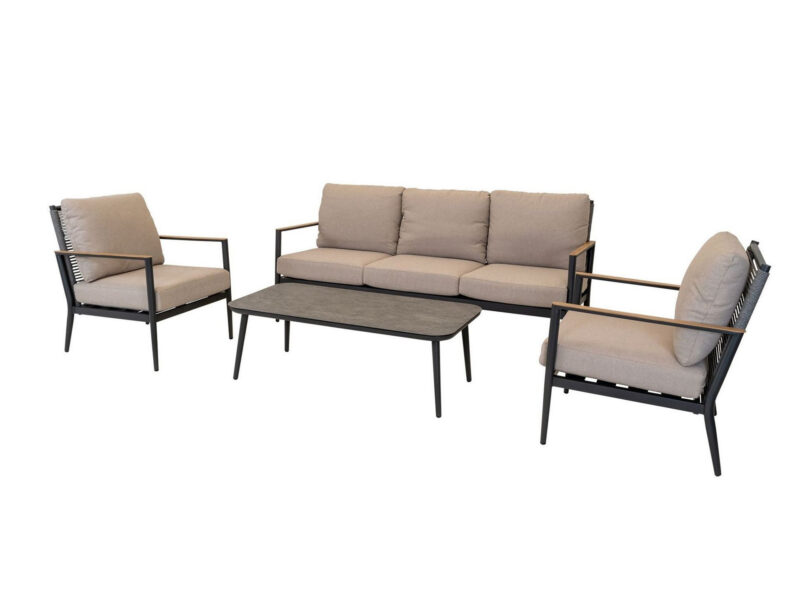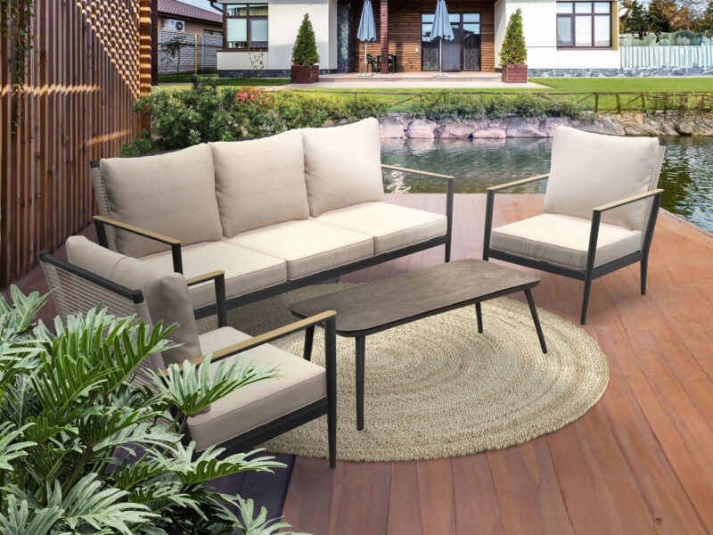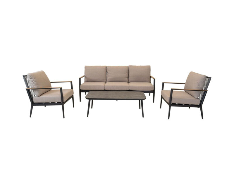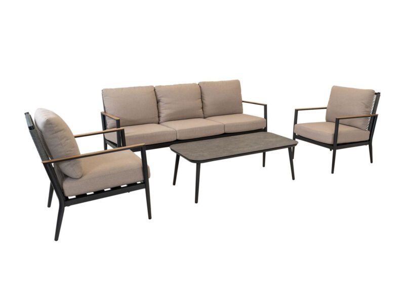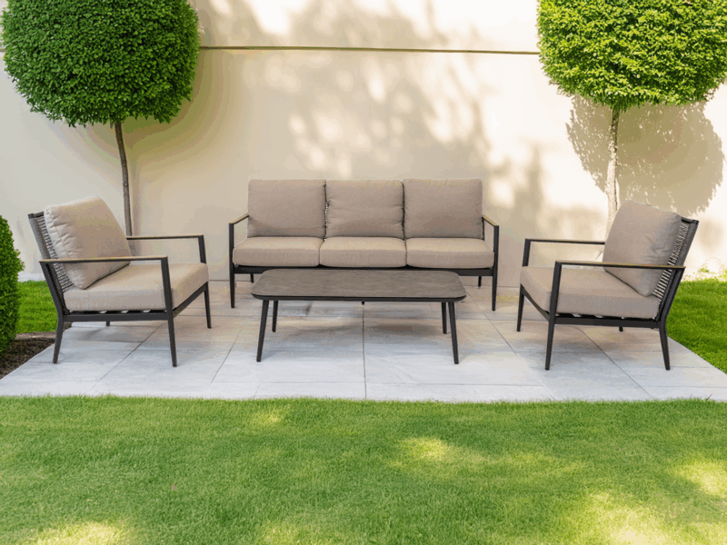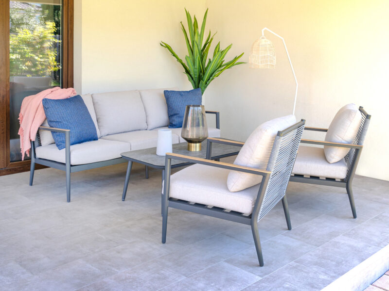 Moderná sedacia súprava Feda prinesie štýl a pohodlie do vášho exteriéru. Kombinuje hliníkový rám v matnej antracitovej farbe, lanový výplet a podušky z odolnej olefinovej látky.