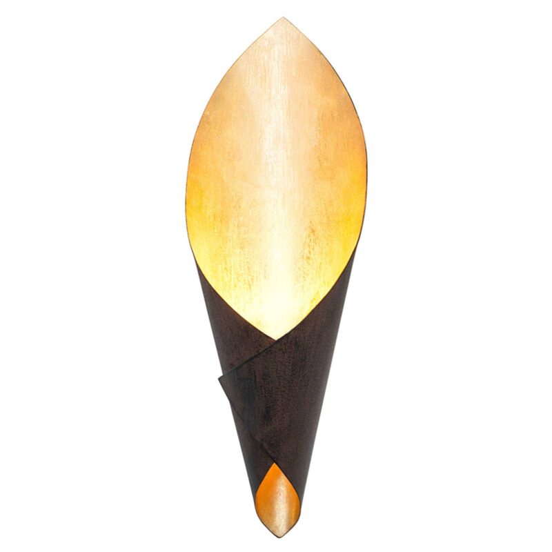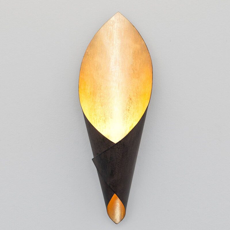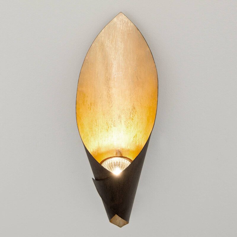 Špicatá nástenná lampa Fiaccola PiccoloKovové tienidlo nástennej lampy Fiaccola Piccolo s veľkým otvorom v hornej časti a zlatou farbou vnútri bolo vyrobené z čiernohnedého železa. Dizajn trochu pripomína kvet kaly. Zlatý vnútrajšok tienidla veľmi jemne priťahuje svetlo halogénovej lampy a rozhodujúcou mierou prispieva k zvláštnemu efektu nástennej lampy.