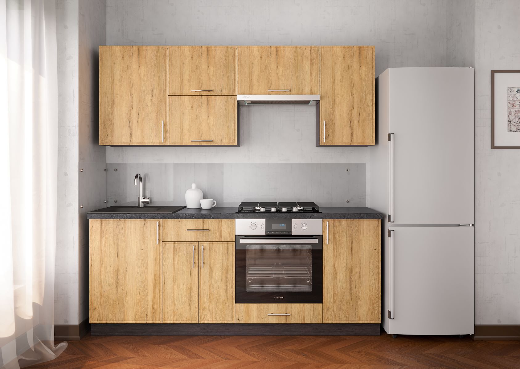 Moderná kuchyňa FIJONA 200 zaujme kontrastným farebným prevedením dub wotan/wenge a praktickým rozložením skriniek. Dvierka sú vyrobené z kvalitnej MDF dosky, strieborné úchyty sú plastové. Súčasťou kuchyne je sokel.Výška horných skriniek je 72 cm, hĺbka je 32 cm.Výška dolných skriniek je 82 cm, hĺbka je 60 cm (vnútorná 47 cm).Kuchynská zostava obsahuje:1 ks horná jednodverová skrinka 50 cm1 ks horná dvojdverová skrinka 50 cm1 ks horná digestorová skrinka 60 cm1 ks horná jednodverová skrinka 40 cm1 ks dolná jednodverová drezová skrinka 50 cm1 ks dolná dvojdverová so zásuvkou 50 cm1 ks skrinka na vstavanú rúru 60 cm1 ks dolná jednodverová skrinka 40 cmPracovná doska nie je súčasťou kuchynskej zostavy, ale môžete si ju u nás dokúpiť.Spotrebiče nie sú v cene zostavy.Dodávame v demonte.