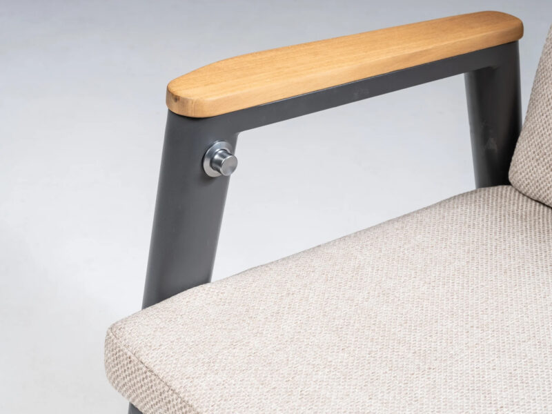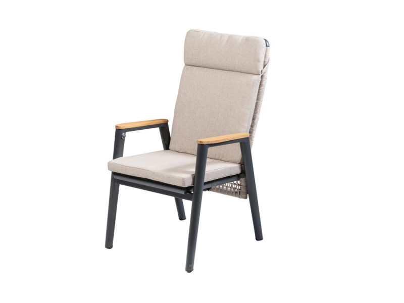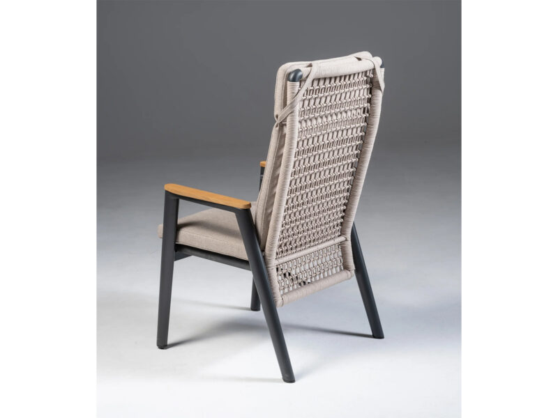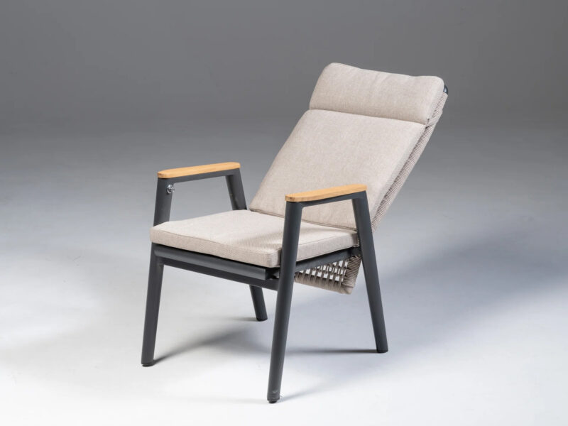 Fisherman polohovateľná stolička s podrúčkami prináša maximálne pohodlie vďaka hliníkovému rámu, teakovým opierkam a Rope výpletu na zadnej strane. Operadlo je možné nastaviť pomocou plynovej pružiny. Vodeodolné vankúše zabezpečujú komfort aj v exteriéri.