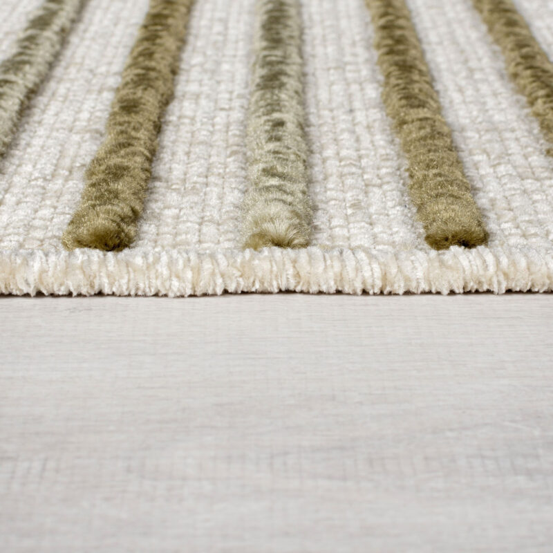 Svetlo béžový koberec zdobený pruhovými vzormi v rôznych odtieňoch zelenej farby oživí každý interiér svojou sviežosťou a štýlom. Jeho povrch tvorí zmes polypropylénu a polyesterovej ženilky, čo mu dodáva mimoriadnu hebkosť. Vďaka rôznym dĺžkam vlasu vzniká pútavý 3D efekt. Koberec je odolný voči UV žiareniu a ľahko sa udržuje – stačí pravidelné vysávanie alebo pranie pri 30 °C.