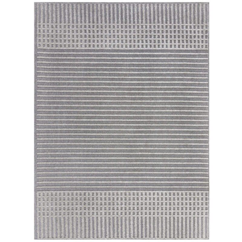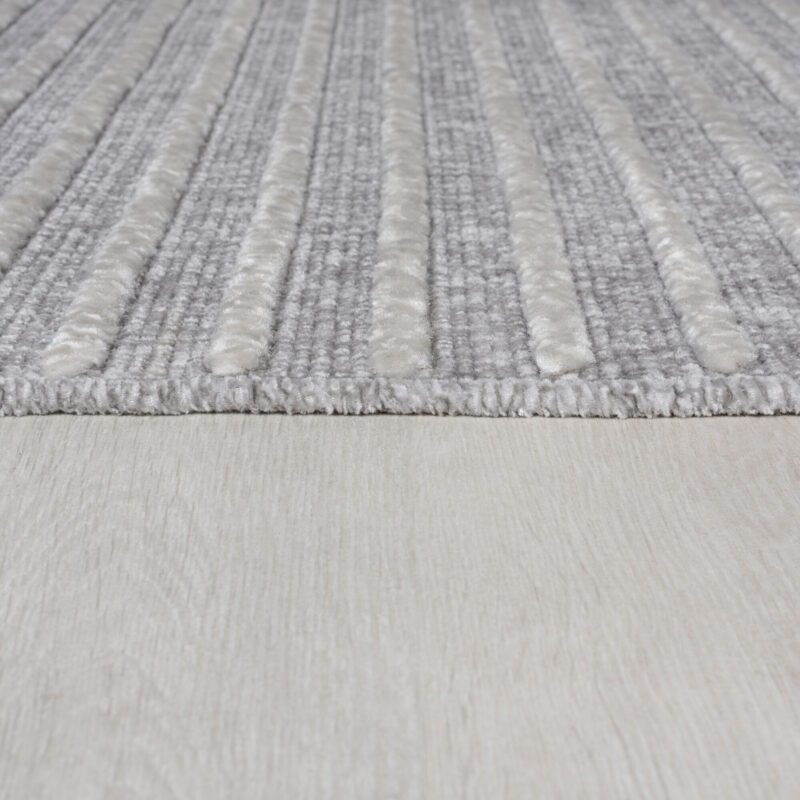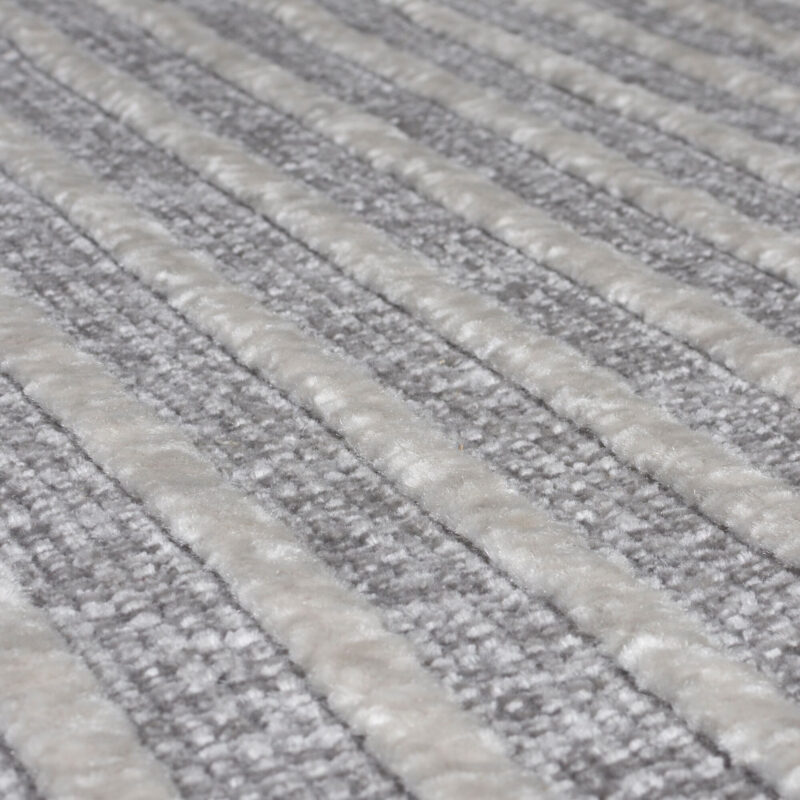 Koberec so šedým základom a krémovo bielymi pruhmi pôsobí moderne a vkusne, vďaka čomu sa hodí do rôznych interiérov. Jeho povrch tvorí kombinácia polypropylénu a polyesterovej ženilky, čo zaisťuje výnimočnú hebkosť. Vďaka rôzne dlhému vlasu vytvára zaujímavý 3D efekt. Koberec je odolný voči UV žiareniu a je možné ho ľahko udržiavať pravidelným vysávaním či praním pri 30 °C.