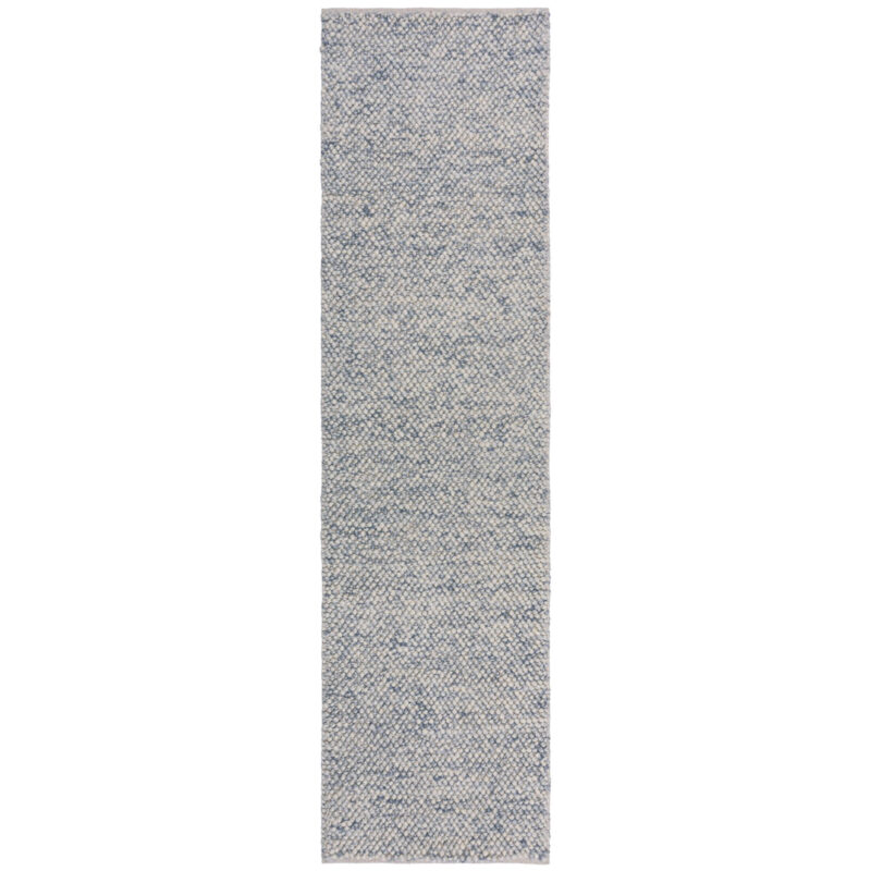 Behúň kombinujúci krémovo biele a modré vlákna ponúka zaujímavú štruktúru pripomínajúcu jemné kamienky, ktorá je nielen vizuálne atraktívna, ale aj príjemná na došľap. Je ručne vyrobený zo zmesi vlny a polyesteru, a preto zaisťuje skvelú izoláciu proti chladu a hluku. Vďaka svojej mäkkosti je ideálny pre spálne alebo obývacie izby, kde poskytuje komfortný pocit pri chôdzi bosou nohou.