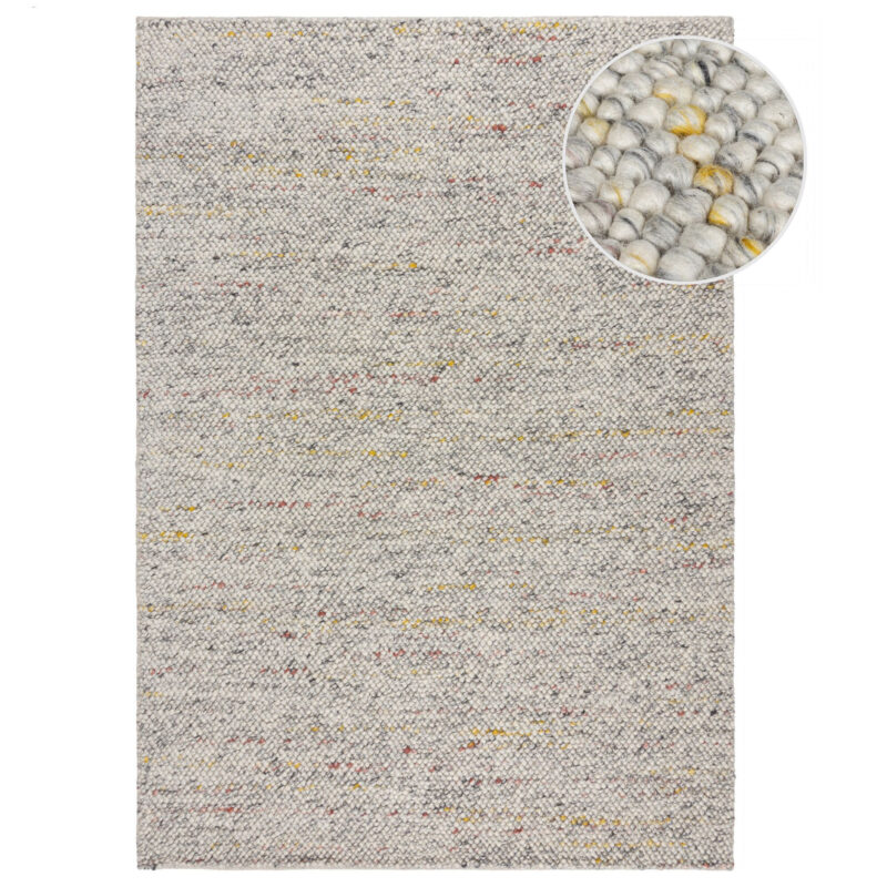 Koberec s krémovo bielymi a čiernymi vláknami ako základom je oživený žltými a červenými akcentmi, ktoré vytvárajú hravý a moderný vzhľad. Štruktúrovaný povrch pripomínajúci jemné kamienky poskytuje príjemný pocit pri chôdzi a dodáva interiéru zaujímavý prvok. Kombinácia vlny a polyesteru zaisťuje skvelú izoláciu proti chladu aj hluku.