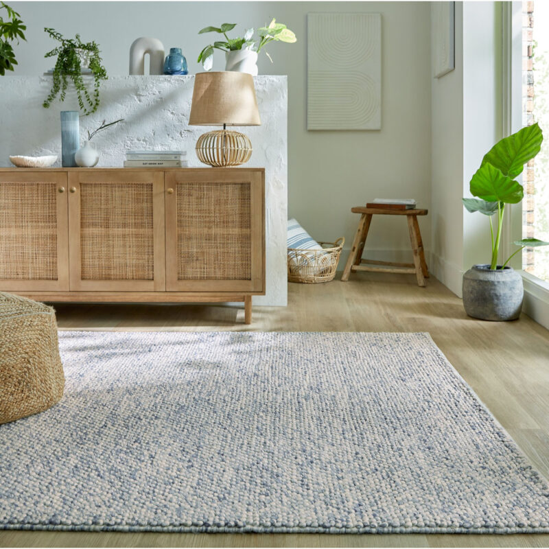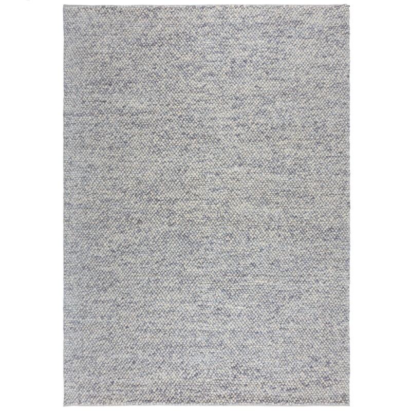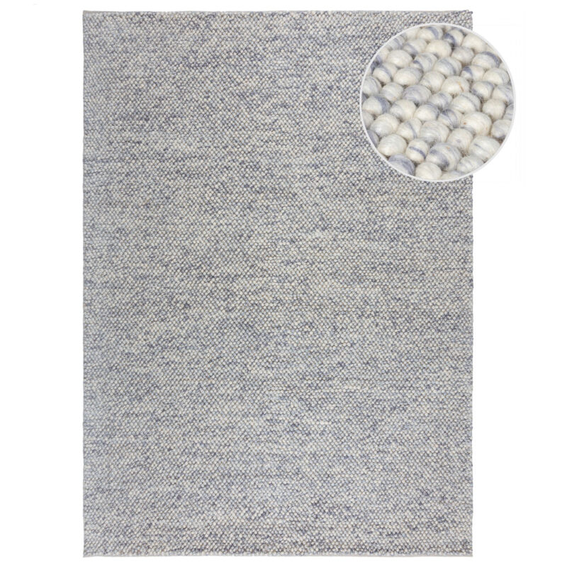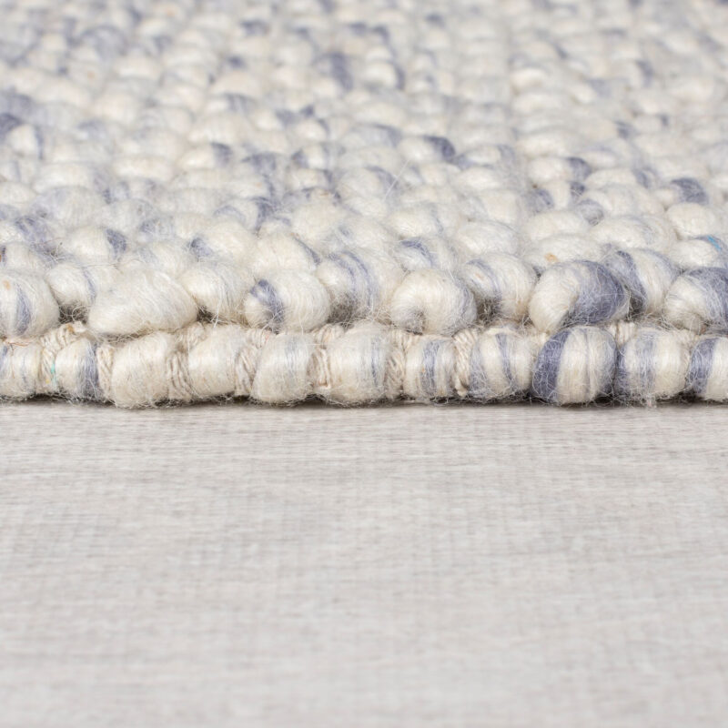 Koberec kombinujúci krémovo biele a modré vlákna ponúka zaujímavú štruktúru pripomínajúcu jemné kamienky, ktorá je nielen vizuálne atraktívna, ale aj príjemná na došľap. Je ručne vyrobený zo zmesi vlny a polyesteru, a preto zaisťuje skvelú izoláciu proti chladu a hluku. Vďaka svojej mäkkosti je ideálny pre spálne alebo obývacie izby, kde poskytuje komfortný pocit pri chôdzi bosou nohou.