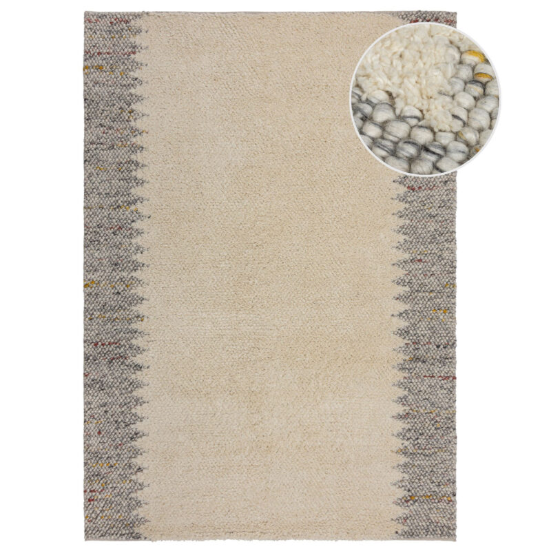 Koberec so stredom z krémovo bieleho strihaného vlasu a tmavšími slučkami po obvode dlhších strán. Táto kombinácia textúr a farieb dodáva kobercu jedinečný charakter a hĺbku. Mäkký stred ponúka pohodlný došľap, zatiaľ čo slučková štruktúra po stranách pridáva dynamiku. Tento kúsok skvele doplní moderný interiér a zaistí príjemnú atmosféru v obývacích izbách alebo spálňach.