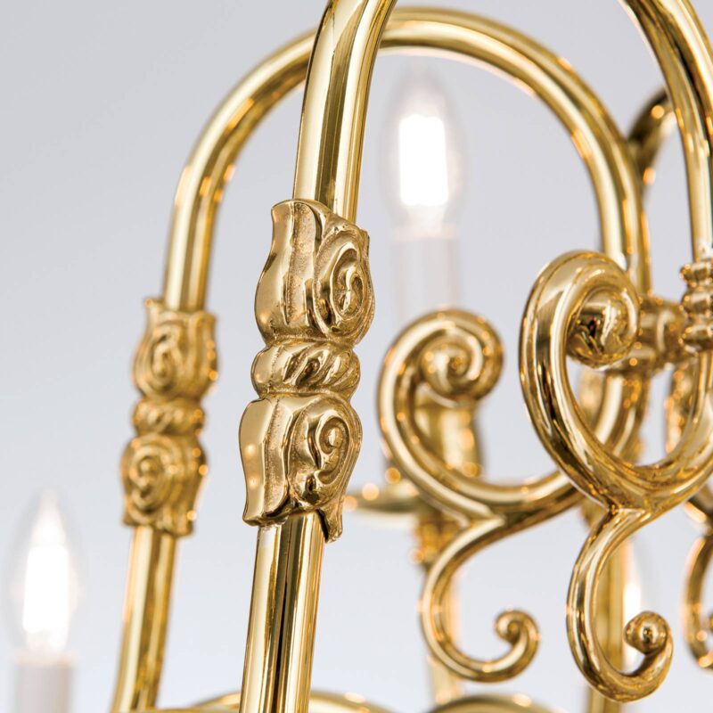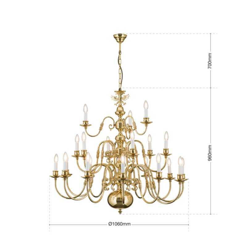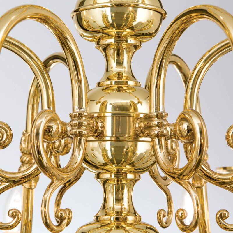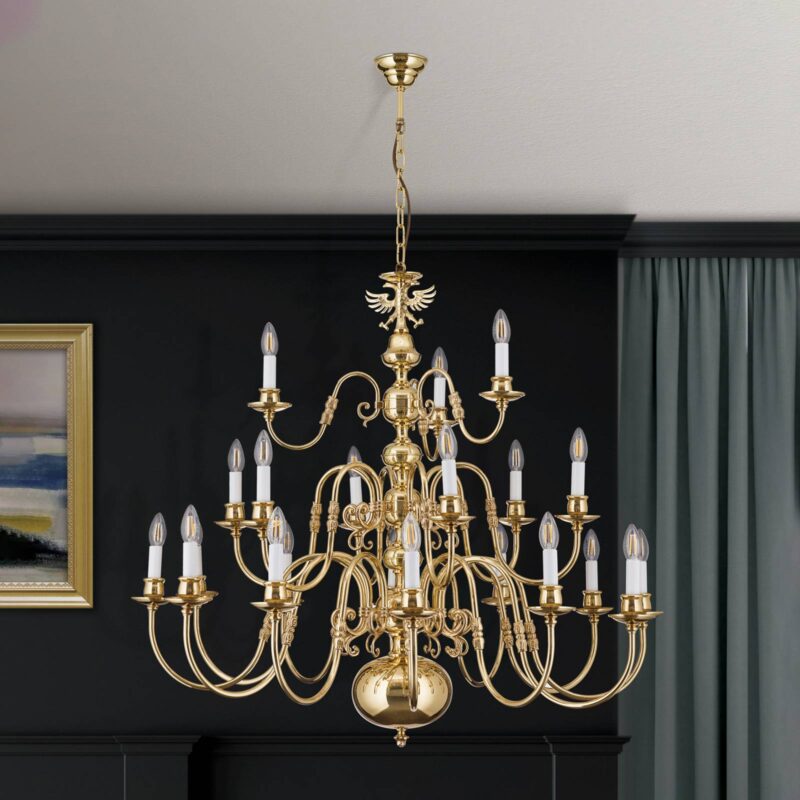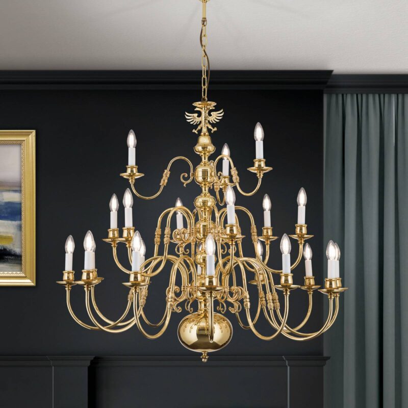 Krásny luster Maximilian na 21 žiaroviek, mosadzný lesk Veľkolepý luster Maximilian vo flámskom štýle zapôsobí konštrukciou z elegantne leštenej mosadze. Tento impozantný osvetľovací objekt je vyrobený ručne. Nádherne lesklý povrch vytvára v spojení s 21 svietnikmi veľkolepú kombináciu. Ramená podstavcov sú filigránske a krásne tvarované. Hlavu lustra zdobí symetricky zrkadlový symbol orla. Luster Maximilian svojimi 21 žiarovkami pohodlne osvetlí veľkú miestnosť. Prepychový vzhľad sa hodí do každej kvalitnej slávnostnej sály. Luster Maximilian je vytvorený na reprezentatívne príležitosti. Kvalitný výrobok z Rakúska.