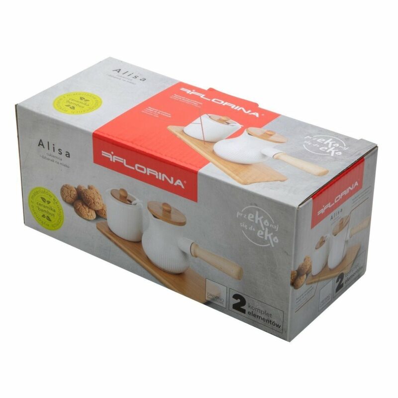 Sada Alisa sa vyznačuje kombináciou klasickej elegancie a funkčnosti bambusového vlákna. Sada sa skladá z cukorničky a džbánku na mlieko z odolnej keramiky. Keramický riad je odolný proti otrasom a škrabancom a možno ho umývať v umývačke. Viečka a stojan sú vyrobené z bambusového dreva, ktoré je odolné proti vlhkosti, neabsorbuje pachy ani farbivá.Vedeli ste, že bambusové vlákno je trikrát odolnejšie než bukové drevo! Vďaka tomu si môžete byť istí, že vám náš návrh bude slúžiť mnoho rokov. Vďaka klasickému tvaru riadu sa dokonale hodí ku každému riadu. Jemné tvary a jednoduchý štýl osloví milovníkov minimalizmu.Rozmery: