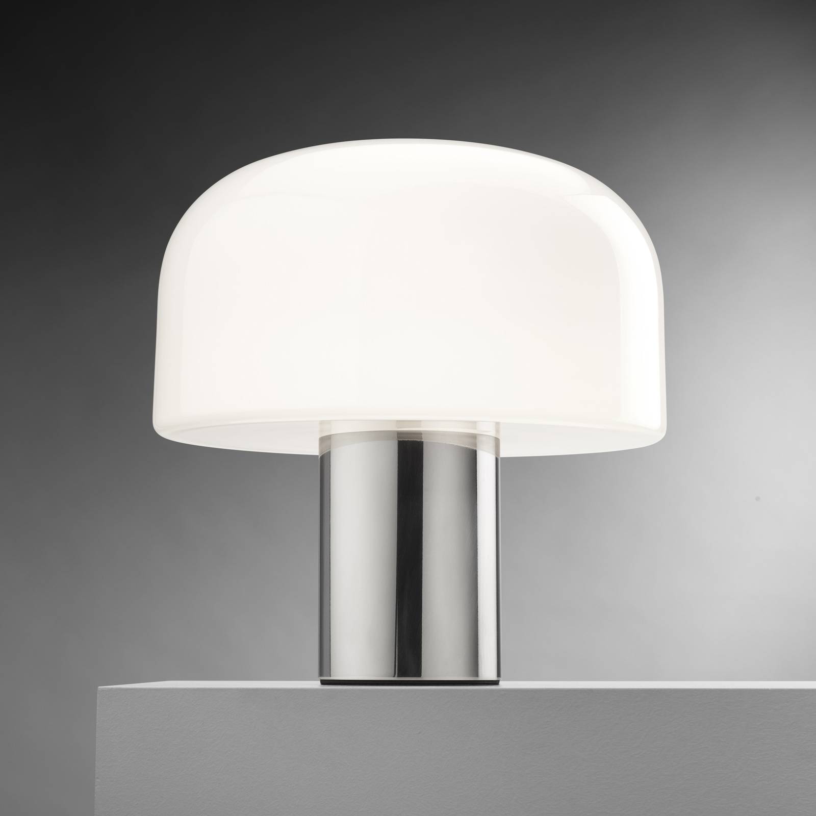 Sklenená stolová lampa Bellhop Glass T by FLOS – vrátane stmievača Kupola pozostáva z trojitého opálového skleneného difúzora, ktorý je vytvorený ako sendvič sklenených vrstiev, biela vrstva medzi dvoma priehľadnými vrstvami, ktoré sú súčasne vyfúknuté. Hrúbky jednotlivých vrstiev sa líšia. Tento dizajn bol vyvinutý v spolupráci s oddelením výskumu a vývoja spoločnosti Flos. Použitie triplexného opálového skla a veľký formát, ktorý vytvára vzdialenosť medzi zdrojom svetla a vnútorným povrchom difúzora, poskytujú rovnomerné, teplé a príjemné svetlo, ktoré v miestnosti vytvára príjemnú atmosféru. Tienidlo skleneného svietidla Bellhop spočíva na valcovej hliníkovej základni.