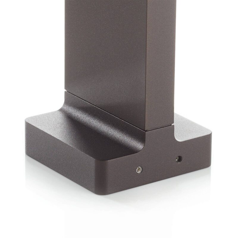 Casting T 100 – vysokokvalitná LED lampa s päticou v tmavohnedej farbe Vďaka dvojitej práškovej povrchovej úprave je táto tmavohnedá LED lampa s päticou Casting T 100 mimoriadne odolná voči poveternostným vplyvom. Hranaté svietidlo pripomínajúce T-profily bolo vyrobené z lisovaného a tlakovo liateho hliníka a jeho povrch bol najprv opieskovaný, aby sa dosiahla lepšia priľnavosť náteru. Prvá epoxidová prášková farba zabezpečuje odolnosť voči mechanickým a chemickým vplyvom, druhá vrstva je vyrobená z polyesteru a chráni povrch, a tým aj tmavohnedú farbu, pred UV žiarením a poveternostnými vplyvmi. Vďaka krytiu IP65 je svietidlo chránené proti prachu a prúdom vody, čo okrem iného zabezpečuje sklenený difúzor s textúrou pripevnený k chladiču svietidla. Textúra skleneného difúzora umožňuje rovnomerné a homogénne vyžarovanie svetla. Casting T 100 je svietidlo vyrobené v Taliansku, ktoré nadchne prvotriednou kvalitou a najlepším spracovaním.