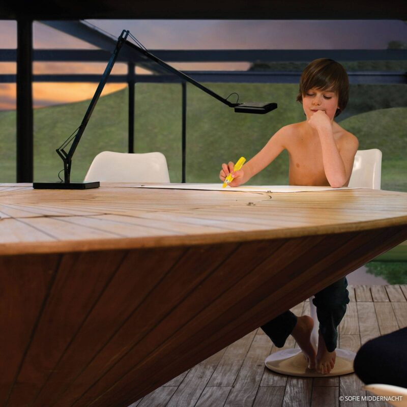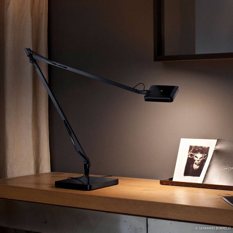 Stolové svietidlo KELVIN LED – maximálna flexibilita s módnym dizajnom Energetická účinnosť a inovatívna prevádzka sa stretávajú s jasne redukovaným dizajnom: stolové svietidlo Kelvin LED je nielen funkčným zdrojom svetla na pracovisku, ale aj módnou alternatívou v obytnej zóne, napríklad ako svetlo na čítanie. Dvojité rameno pantografu a nastaviteľná hlava zaručujú vysokú flexibilitu. Elektronický vypínač na hornej strane hlavy reflektora je mimoriadne praktický – pomocou neho možno stolnú lampu LED pohodlne ovládať. Okrem toho je svietidlo vybavené prepínačom zeleného režimu, ktorý umožňuje svietidlu ušetriť ešte viac energie vďaka regulácii v závislosti od denného svetla. Už viac ako 50 rokov navrhuje spoločnosť FLOS s tímom renomovaných dizajnérov špeciálne a vysokokvalitné svietidlá, ktoré získali široké medzinárodné uznanie a mnoho ocenení. Stolnú LED lampu KELVIN navrhli Antonio Citterio a Toan Nguyen, ktorí sa už môžu pochváliť dlhou kariérou dizajnérov.
