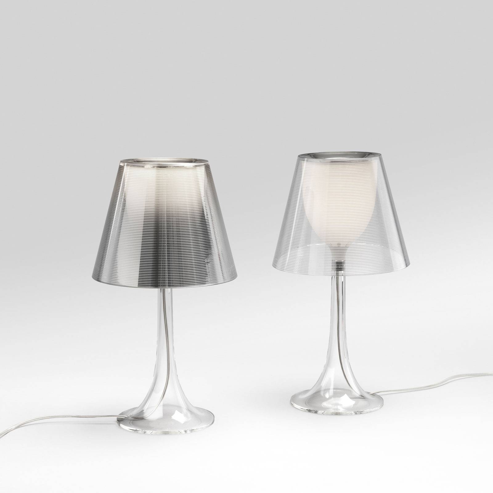 Miss K – elegantná dizajnová stolová lampa so stmievačom Táto stolová lampa je vysokokvalitným doplnkom pre moderne zariadené obývacie izby a salóny. Ponúka šikovnú symbiózu nadčasovej základnej formy a atraktívnych detailov. Konkávne zakrivená základňa je vyrobená zo vstrekovaného plastu PMMA. Žiarovka E27 (nie je súčasťou balenia – pozri príslušenstvo) je umiestnená v difúzore z opálového polykarbonátu, ktorý je modelovaný ako pohár otvorený v hornej časti. Najmä pri zapnutom svetle sa javí ako svetelná vnútorná guľa. Ten je obklopený vonkajším tienidlom v tvare nadčasového zrezaného kužeľa. Tu sa používa priesvitný polykarbonát, ktorý je aluminizovaný v špeciálnom vákuovom procese, čím získava jemnú štruktúru. Zásuvný kábel je vybavený stmievacím spínačom, ktorý umožňuje zapínanie a vypínanie stolnej lampy a reguláciu svetelného výkonu. Miss K je návrh francúzskeho architekta a dizajnéra Philippa Starcka, ktorý je medzinárodne známy mnohými výtvormi v oblasti interiérového dizajnu. Stolnú lampu vyrába talianska spoločnosť FLOS, ktorá sa vyznačuje jednoduchým a rafinovaným dizajnom, ako aj modernými materiálmi a výrobnými technikami.
