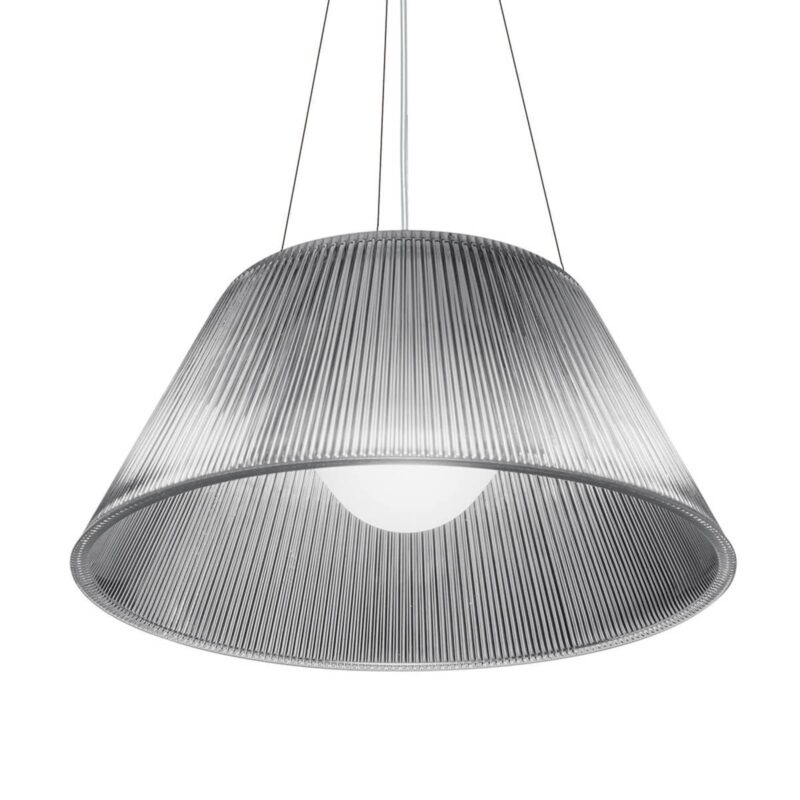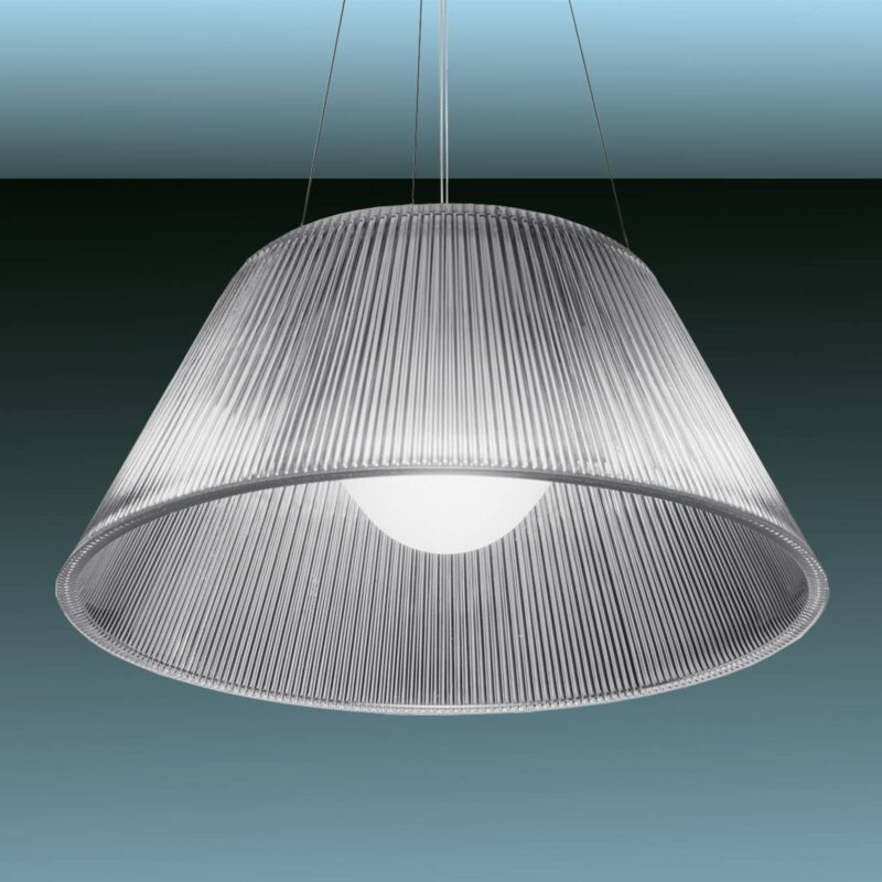 Závesné svietidlo Romeo Moon S2 od spoločnosti FLOS má sklenené tienidlo s drážkovaným vzhľadom Pomerne hrubý dizajn drážok skleneného tienidla pripomína dizajnový štýl minulých desaťročí a zároveň zabezpečuje mierne stlmenie a príjemné rozloženie svetla v miestnosti. Pomerne vysoká priehľadnosť a čírosť tienidla zároveň dodáva závesnému svietidlu Romeo Moon S1 výraz ľahkosti, ktorý vyzerá dobre v každom obytnom priestore. Klasika pre celý obytný priestor, ktorú v roku 1996 vymyslel dizajnér Philippe Starck, spoločnosť FLOS existuje už viac ako 50 rokov a s tímom renomovaných dizajnérov vytvára špeciálne svietidlá vysokej kvality, ktoré získali široké medzinárodné uznanie a množstvo ocenení.