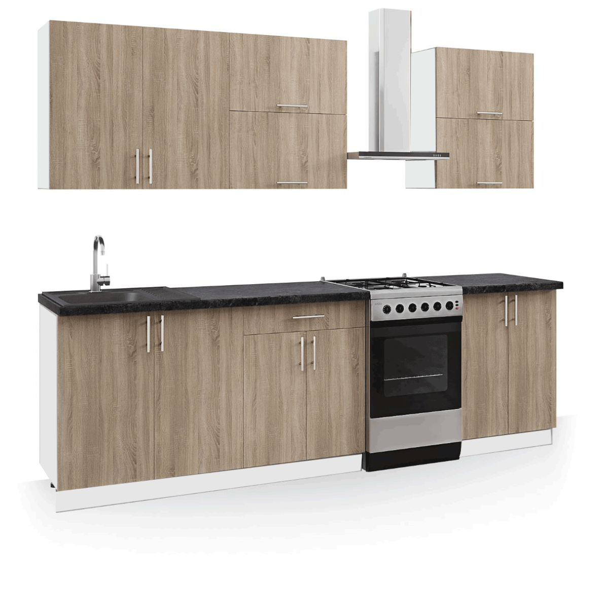 Kuchynská linka FORESTA 200 je veľmi jednoducho riešená a poteší mimoriadne priaznivou cenou. Farebné prevedenie dub truffel/biela je zvýraznené striebornými plastovými úchytmi. Je vyrobená z kvalitnej LTD dosky nenáročnej na údržbu a súčasťou kuchyne je sokel.Výška horných skriniek je 72 cm, hĺbka je 32 cm.Výška dolných skriniek je 82 cm, hĺbka je 60 cm (vnútorná 47 cm).Kuchynská zostava obsahuje:1 ks horná dvojdverová skrinka 80 cm2 ks horná dvojdverová skrinka 60 cm1 ks dolná dvojdverová drezová skrinka 80 cm1 ks dolná dvojdverová skrinka so zásuvkou 60 cm1 ks dolná dvojdverová skrinka 60 cmPracovná doska nie je súčasťou kuchynskej zostavy, ale môžete si ju u nás dokúpiť.Spotrebiče nie sú v cene zostavy.Dodávame v demonte.