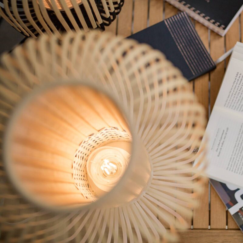 Prírodné materiály sa stretávajú s moderným dizajnom – stolová lampa Bamboo Light Pre sériu Bamboo Light je charakteristické remeselné spracovanie prírodných a autentických materiálov. Dizajnér Arik Lévy vytvára svetlá, ktoré poetickým spôsobom kombinujú prírodu a dizajn. Stolová lampa Bamboo Light je vyrobená z dreva a bambusu, vďaka čomu vzdušné usporiadanie bambusových stojok z vonkajšieho tienidlo na lampu odhaľuje difúzor vo vnútri. Svetlo môže jemne presvitať cez pletený a tkaný bambusový difúzor a vrhá jemné tiene na stenu. Vytvorí sa jedinečný a útulný svetelný obraz. Okrúhly podstavec a spodná plocha tienidlo na lampu a difúzora sú farebne odlíšené. Na kábli je umiestnený vypínač na zapínanie a vypínanie svetelného zdroja E27 (okrem).