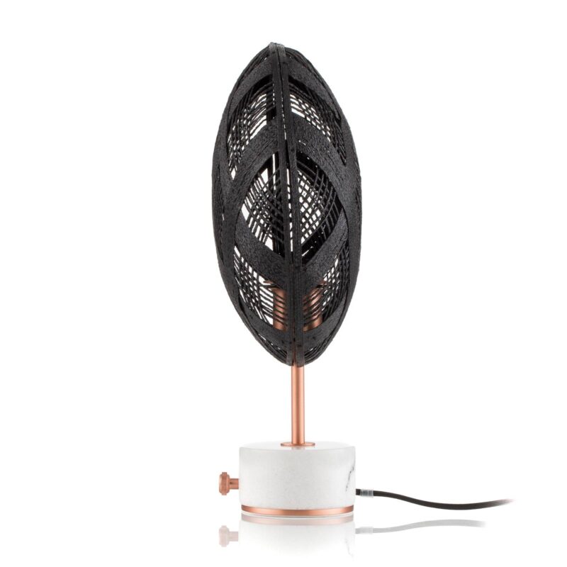Stmievateľná stolová lampa Chanpen s tienidlo na lampu z banánového konope tienidlo na lampu stolovej lampy Chanpen je kruhové a vyzerá nie úplne nepodobne splnu, čo sa prekladá ako „Chanpen“. tienidlo na lampu je pokrytý vláknami z banánového konope, tiež známeho ako abacá. Diagonálne vlákna vytvárajú diamantový vzor, ktorý pripomína výbrus diamantov. Chanpen je možné stlmiť pomocou rotačného stmievača integrovaného v základni. Dizajnér Anon Pairot vyvinul sériu žiaroviek Chanpen pre francúzskeho výrobcu žiaroviek Forestier . Pracoval už pre známe značky ako Fendi, Habitat alebo Grohe a v spoločnosti Forestier sa mohol stretnúť s jeho preferenciou pre prácu s prírodnými a udržateľnými materiálmi a pre spoločnosť Chanpen navrhnúť lampu z konope.