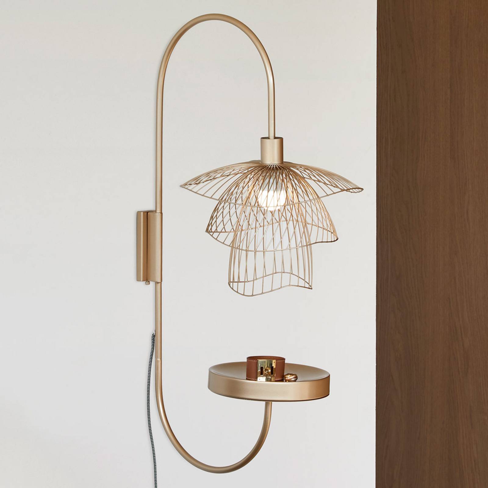 Vzdušné dizajnové nástenné svetlo Papillon XS s odkladacou plochou a napájacím káblom Toto očarujúce nástenné svetlo Papillon XS od dizajnérky Élise Fouin vytvára geometrické tvary v štýle 50. rokov a upriamuje pozornosť diváka na vzdušné a ľahké tienidlo na lampu. Tri nad sebou umiestnené kopule rôznych veľkostí, vyrobené z vzdušných kovových drôtov a s vlnitým okrajom, tvoria jedinečné tienidlo na lampu okolo pätice E14. Pri zapnutí svetelného zdroja vznikajú úžasné svetelné efekty, ktoré fascinujú jedinečnou hrou svetla a tieňa na stene. Tienidlo na lampu visí ako lucerna na ohnutej tyči, ktorá má na spodnom konci okrúhlu odkladaciu plochu na vystavenie obľúbených predmetov. K svietidlu je pripojený kábel so zástrčkou, na ktorom je umiestnený aj vypínač na zapnutie a vypnutie. Dizajnérka Élise Fouin kladie dôraz na samotný materiál a predmet tak trochu odsúva do pozadia. Jej diela sa vyznačujú použitím recyklovaných materiálov ako suroviny, ktoré sú neustále vynovované a premenené na udržateľné a poetické svietidlá.