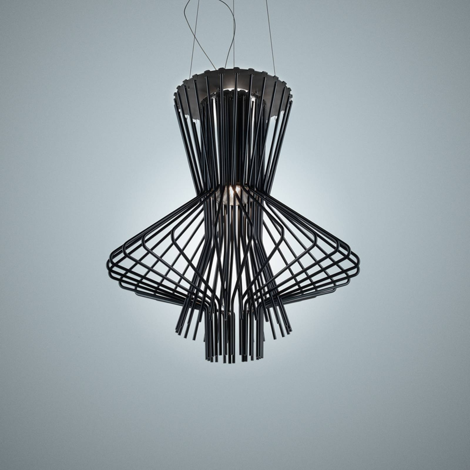 Dekoratívne závesné svietidlo Allegretto Ritmico z jemných kovových vzpierZávesné svietidlo Allegretto Ritmico pozostáva z pochrómovanej kovovej konštrukcie a hliníka. Táto štruktúra vytvára špeciálny trojrozmerný tvar závesného svietidla, ktorý sa vyznačuje harmonickou kompozíciou jemných vzpier. Allegretto Ritmico sa smerom zhora nadol zužuje a má tiež vystupujúci tvar, ktorý sa vytvára približne od stredu lampy. Svetelný zdroj je umiestnený v hornej časti a vyžaruje svetlo priamo k podlahe. Kovové vzpery vytvárajú v obývacej izbe mimoriadne krásny efekt svetla a tieňa. Allegretto Ritmico je ideálne napríklad na osvetlenie obývačky alebo jedálenského stola. Závesné svietidlo funguje samostatne, ale možno ho kombinovať aj s inými svietidlami tejto série. Lampu navrhlo trio Atelier Oï, ktoré už získalo množstvo medzinárodných ocenení. Projekty týchto troch dizajnérov zahŕňajú architektúru a interiérový dizajn, ako aj produktový dizajn a scénografiu. Ich umeleckú filozofiu charakterizuje multidisciplinarita, radosť z experimentovania a úzky vzťah k materiálom. Navrhli série Allegretto a Allegro pre talianskeho výrobcu osvetlenia Foscarini. Hudobné názvy zbierok vychádzajú zo zvuku kovových vzpier pri ich náraze.