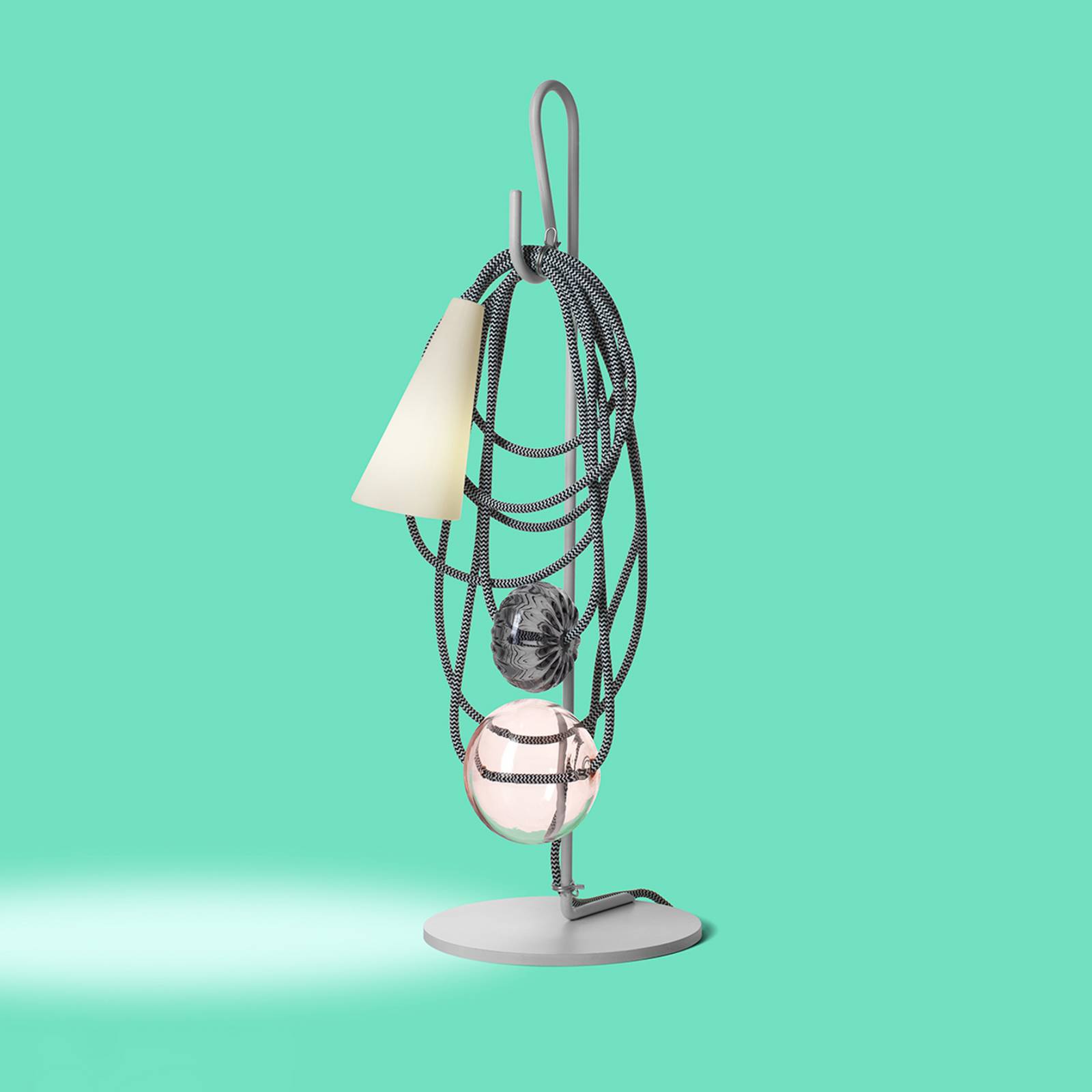 Dekoratívna stolová LED lampa Filo s neobyčajným dizajnomStolová LED lampa Filo je zložená z rôznych prvkov a materiálov a vďaka svojmu neobyčajnému dizajnu sa stane osobitným pútačom pozornosti v obytnom priestore. Rám stolnej lampy je vyrobený z kovu a slúži ako držiak kábla, ktorý je vybavený farebným textilným plášťom. Dekoratívne sklenené prvky sú fúkané ústami, boli formované a spracované ručne. Zaujímavú kompozíciu komponentov dotvára kužeľovité tienidlo, ktoré obklopuje svietidlo a bolo vyrobené z porcelánu. Stolná lampa sa zapína a vypína pomocou vypínača integrovaného v kábli.Filo je vhodná na použitie napríklad v obývacej izbe alebo na chodbe. Vďaka univerzálnym variantom dizajnu sa stolná lampa ľahko hodí do rôznych obytných prostredí. Teplé svetlo sa rozptyľuje cez biele tienidlo smerom k podlahe a vytvára útulnú atmosféru. Stolnú lampu navrhol taliansky dizajnér Andrea Anastasio. Jeho cieľom bolo vytvoriť scénu pre jednotlivé komponenty svietidla a zdôrazniť ich technické a estetické kvality. Chcel tiež dať väčší význam dekorácii začlenením sklenených prvkov, ktoré sa primárne nespájajú so svietidlami.