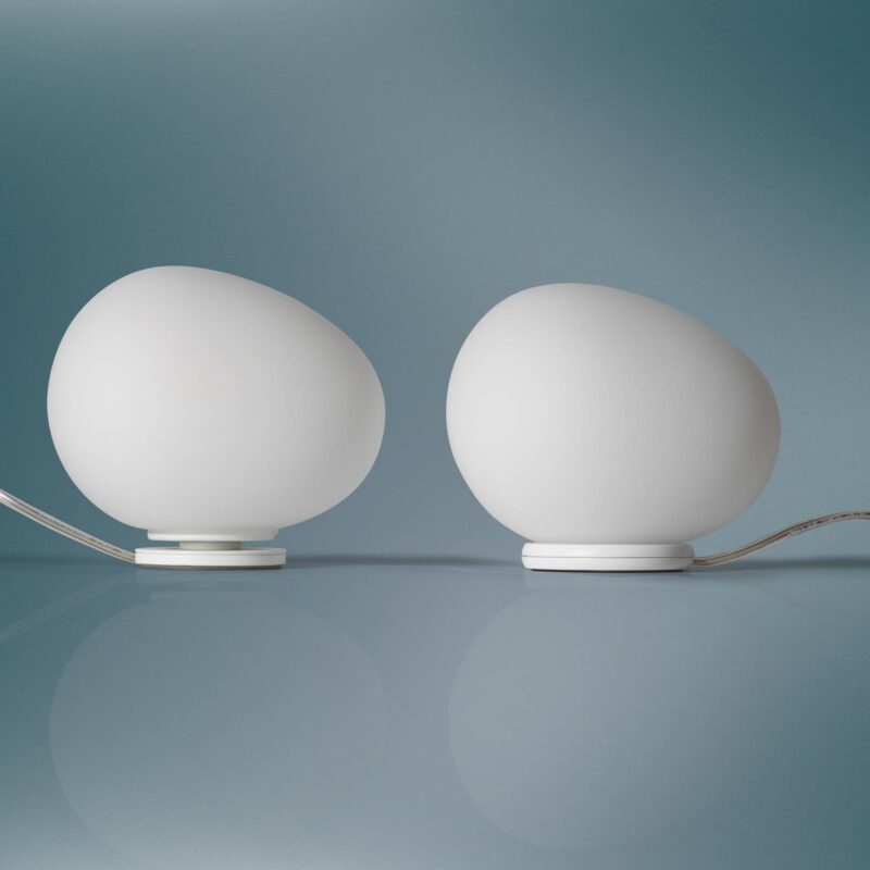 Stolová lampa Gregg piccola s jemným vyžarovaním svetla cez tienidlo zo satinovaného skla Organický tvar stolovej lampy Gregg od spoločnosti Foscarini, ktorý sa vždy zdá byť iný v závislosti od uhla pohľadu, pripomína kamienok, ktorý postupne vybrúsil riečny prúd. Tienidlo z fúkaného, kyselinou leptaného skla chráni zdroj svetla po celom obvode, takže je zaručená absolútna neoslňujúca žiara a homogénne vyžarovanie svetla. Jas možno plynule regulovať pomocou stmievača na priehľadnom kábli. Gregg je jedným z návrhov viacnásobne ocenenej dizajnérskej dvojice Ludovica + Roberto Palomba.