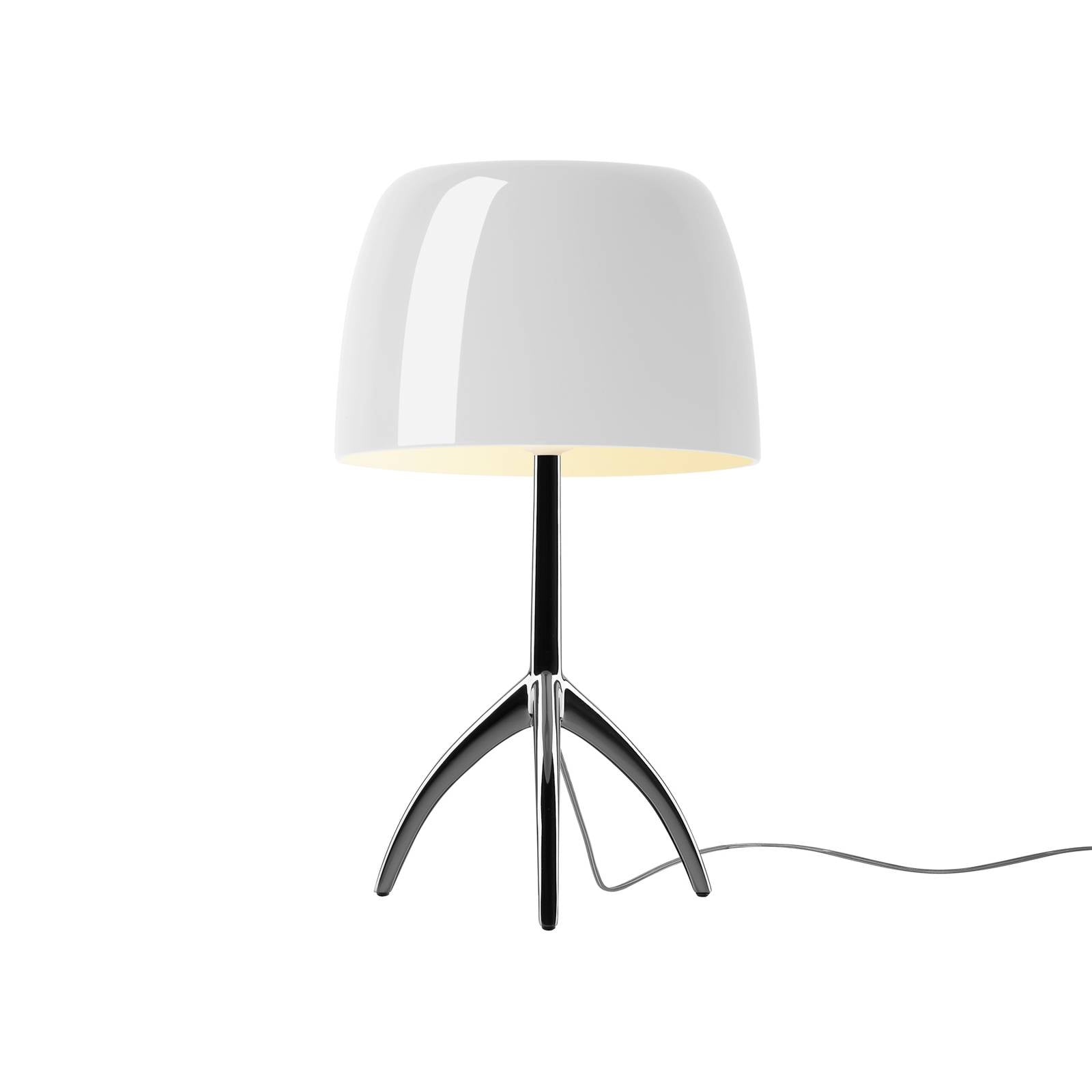 Stolová lampa LED Lumiere grande s tienidlom z fúkaného skla Prvú verziu stolovej lampy Lumiere od Rodolfa Dordoniho predstavila spoločnosť Foscarini v roku 1990 a odvtedy získala kultový status. Dizajnový kúsok tak už dokázal svoju nadčasovú krásu a zachované sú aj vysoké štandardy kvality prémiového výrobcu. Tienidlo je vytvorené zo skla špeciálnou technikou spracovania a je umiestnené na trojnožke z hliníka. Svetlo svieti bez oslnenia smerom nadol a jemne cez difúzor. V prípade potreby možno jas stlmiť pomocou stmievača v prívodnom potrubí.