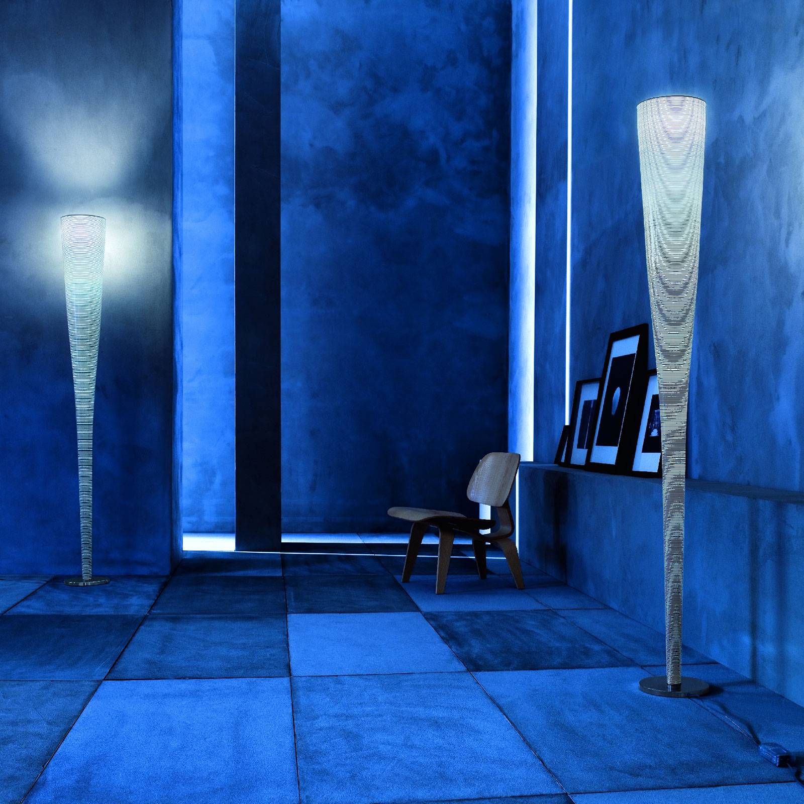 Foscarini Mite – LED stojacia lampa zo sklenenej tkaniny a uhlíkových vlákien Impozantná stojacia lampa LED Mite od spoločnosti Foscarini svojou optikou pripomína nadrozmernú fľašu na šampanské. Telo svietidla, ktoré je v spodnej časti stále veľmi štíhle, sa smerom hore rozširuje, aby vyžarovalo harmonické okolité svetlo smerom k stropu prostredníctvom svetelného zdroja LED inštalovaného v hornej časti svietidla. Mite však nie je výnimočný len svojím vzhľadom – materiály, z ktorých je vyrobený, sa nenachádzajú v každom svietidle. Dizajnér Marc Sadler zvolil ako základný materiál pre ľahkú karosériu sklenené vlákno, ktoré je doplnené drôtom z uhlíkových vlákien. Na dosiahnutie dokonalej syntézy medzi technológiou a dizajnom Sadler rozvinul myšlienku opakovaného navíjania uhlíkového drôtu okolo základnej formy skleneného vlákna. Tak vznikla Mite – dizajnová stojacia lampa s výrazným charakterom, ktorú už druhýkrát nenájdete. Technológia slúži ako nosná konštrukcia a dekorácia zároveň. Prstencový vzor pripomínajúci kokón potom vystupuje do popredia, keď sa jasné svetlo LED jemne šíri smerom nadol cez šachtu svietidla. Intenzitu svetla stojacej lampy Mite možno plynule regulovať pomocou stmievača, ktorý je integrovaný do priehľadného prívodného kábla. Tento dizajnový kúsok tak zaručuje správne osvetlenie v každej situácii.