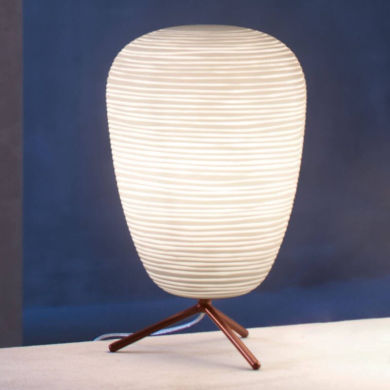 Foscarini Rituals 1 – Stolová lampa z fúkaného skla, so stmievačom Stolová lampa Rituals 1 od spoločnosti Foscarini vyžaruje čistú relaxáciu a rovnováhu. Jeho tienidlo z fúkaného skla pripomína svojím tvarom a štruktúrou menej pevné sklo, ale skôr ľahký japonský papier. V súlade so svojím názvom Rituals dokazuje, že osvetlenie pozadia pri meditácii alebo relaxácii nemusí nevyhnutne pochádzať zo zdrojov svetla z prírodných materiálov, ale že aj svietidlá zo skla môžu vyčarovať príjemnú atmosféru pohody. Horizontálne kruhy prechádzajúce cez tienidlo svietidla sú vytvorené špeciálnou technikou spracovania skla nazývanou „a fermo“. Pri tejto technike fúkania sa sklo vo forme neotáča. Negatívne ozdoby vo forme sa odtláčajú do skla a vytvárajú charakteristický pruhovaný vzor, ktorý sa pôsobivo odhalí po zapnutí svetla. Posledné úpravy sa robia doslova ručne. V neposlednom rade sa ponorením skla do kyseliny vytvára vzhľad podobný sadre. Sklo spočíva na minimalistickom trojnožkovom ráme z lakovaného kovu so zdrsneným povrchom – jasný, ale vhodný kontrast k organicky tvarovanému odtieňu. Foscarini Rituals 1 sa najlepšie hodí do miestností s pokojnou, útulnou atmosférou. Kompozícia rôznych typov a tvarov svietidiel, ktoré ponúka séria Rituals navrhnutá Ludovicou a Robertom Palombovými, pôsobí mimoriadne expresívne. Rituály 1 sa napájajú prostredníctvom priehľadného kábla s integrovaným stmievačom na plynulú reguláciu jasu.