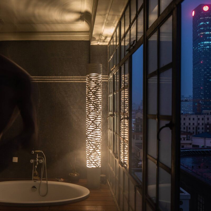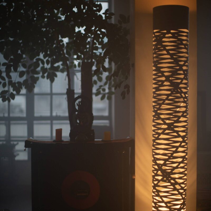 Foscarini Tress grande LED – LED dizajnová stojacia lampa so stmievačom Tress je dizajnová stojacia lampa vyrobená z kompozitného materiálu zo sklených vlákien, ktorá sa dostala do sortimentu celosvetovo známeho výrobcu svietidiel Foscarini v roku 2008 a odvtedy sa teší veľkej obľube ako špeciálna svetelná socha. Navinutím úzkej stuhy zo sklených vlákien okolo rotujúceho valca a jej následným vytvrdením pomocou syntetickej živice vzniklo charakteristické valcové tienidlo tejto stojacej lampy. Výsledkom je zaujímavá štruktúra náhodne sa krížiacich stužiek zo sklenených vlákien, ktoré sa zvodným spôsobom pohrávajú s dopadajúcim svetlom. Dva svetelné zdroje LED nainštalované vo vnútri valca sa navzájom dopĺňajú a vytvárajú dokonalú svetelnú šou. Zatiaľ čo jeden zdroj svetla je ukrytý v základni svietidla, druhý sa nachádza v hornej časti difúzora. Hneď ako sa teplé biele svetlo dostane nahor do difúzora, na podlahe a stenách okolo sa vytvorí neporovnateľný svetelný vzor, pretože svetlo si razí cestu cez početné otvory medzi pásmi sklených vlákien. LED dióda inštalovaná v hlave difúzora dopĺňa svetelný efekt stojacej lampy odrazeným priestorovým svetlom smerujúcim k stropu. Tress je svetelný objekt, ktorý stelesňuje ľahkosť a hravosť, ale zároveň pôsobí jasným dojmom. Na priehľadnom kábli sa nachádza stmievač na plynulú reguláciu jasu.