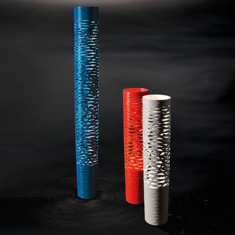 Foscarini Tress media – Stojacia lampa so stuhou zo sklených vlákien, so stmievačom Valcovitá svetelná socha vyrobená z pásky zo sklených vlákien potiahnutej epoxidovou živicou – to je stojacia lampa Tress media od spoločnosti Foscarini. Priemyselný dizajnér Marc Sadler sa v roku 2008 inšpiroval zvodným tvarom spleteného vrkoča a navrhol sériu svietidiel Tress. Pri výrobe mediálnej stojacej lampy Tress sa používa dômyselná koncepcia, ktorá kombinuje strojovo otáčaný tvar valca s detailným ručným spracovaním na konečnú úpravu. Úzka stuha zo sklených vlákien sa omotá okolo valcovej formy a potom sa vytvrdí syntetickou živicou. Výsledkom je charakteristické prepletenie, ktoré vytvára hru svetla a tieňa hneď po zapnutí stojacej lampy. Svetlo a hmota sú dovedna postavené do vzájomného vzťahu – je to zvláštne predstavenie. Možnosť plynulého nastavenia jasu prostredníctvom stmievača v prívodnom vedení sa stáva takmer druhoradou záležitosťou.