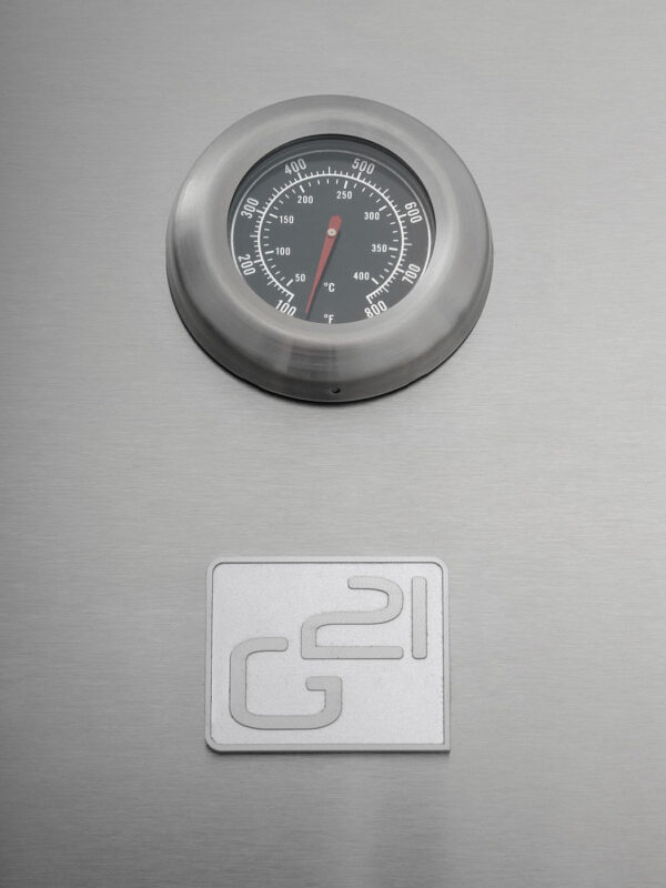 Nerezový gril G21 Argentína je opatrený dvojvrstvovým odklápacím vekom pre zaistenie optimálnej teploty pri grilovaní. Teplomer, prakticky zabudovaný vo veku, vám dá prehľad o aktuálnej teplote pod vekom, takže sa nemusíte báť spáleného alebo naopak nedopečeného mäsa.