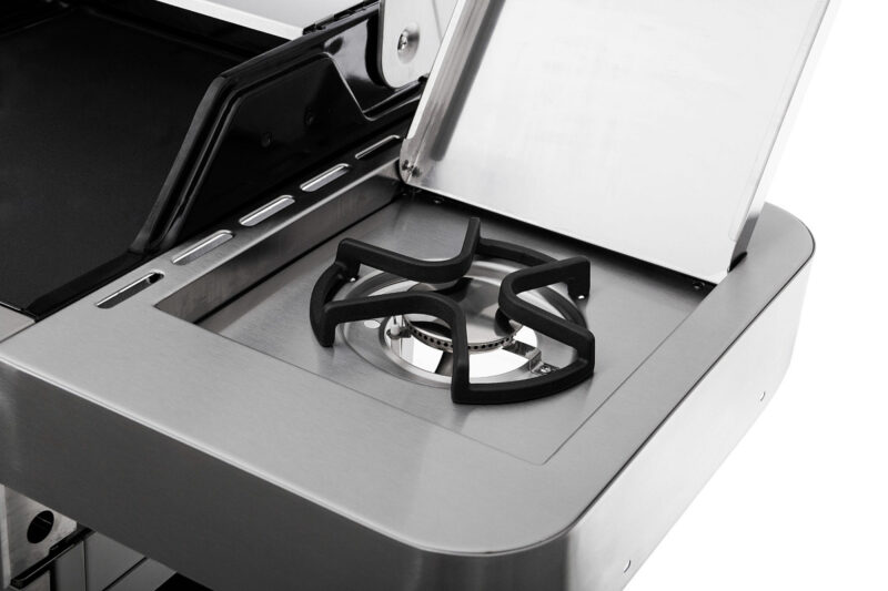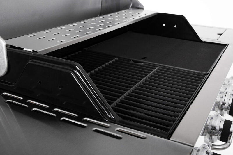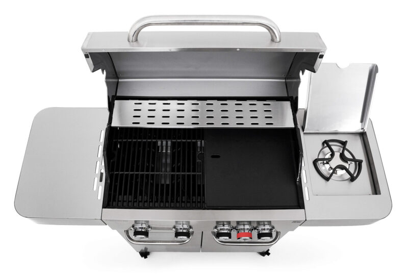 Nerezový plynový gril G21 Argentína BBQ Premium Line s liatinovým roštom, liatinovým plátom. Elektrické zapaľovanie, plynová regulácia, bočný horák s výkonom 3,15 kW, 4 hlavné horáky, každý s výkonom 3,5 kW, systém Flame Tamer.