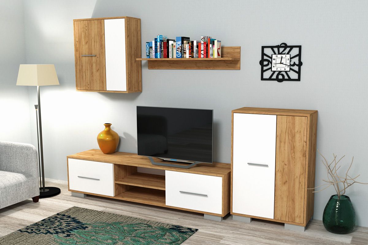 Obývacia zostava GAMORA patrí medzi moderný nábytok.Ponúka viacero prvkov, ktoré sa dajú samostatne umiestniť podľa Vašich potrieb a požiadaviek. Jej variabilita vytvára možnosti viacerým dizajnovým prevedeniam. Výraznými črtami nábytku je kombinácia 2 kontrastných farieb ako aj jednoduché úchyty a širšie nožičky.Zostava sa skladá zo 4 samostatne stojacich prvkov:- závesná skrinka, rozmery (š/v/h): 60 x 67 x 22 cm- TV stolík, rozmery (š/v/h): 160 x 39 x 38 cm- závesná polica (š/v/h): 90 x 19 x 19 cm- dvojdverová skrinka, rozmery (š/v/h): 60 x 89 x 30 cm.Nábytok je vyrobený z LTD dosky, vo farebnej kombinácii dub zlatý/ biely diamant.  Farba biely diamant nesie štruktúru dreva – nie je v lesku (viď detail na obrázku). Obývačka GAMORA je v ponuke len ako zostava.Celkový rozmer zostavy je (š/v/h): 220 x variabilná x 38 cm. Dodávame v demonte. Farba na obrázku sa môže mierne líšiť od farby skutočného materiálu.