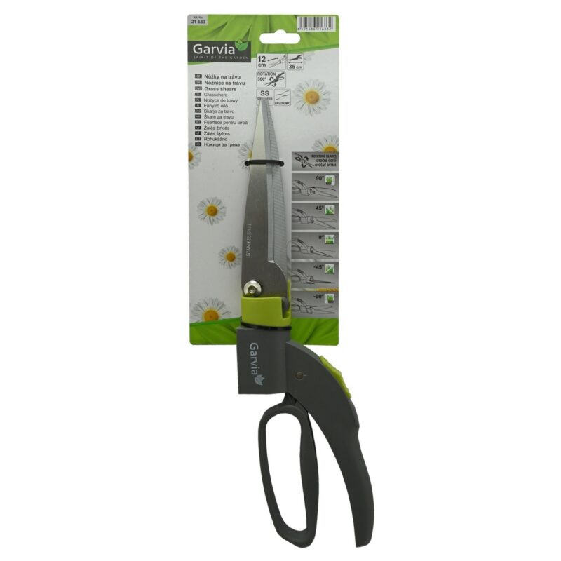 Vysoko kvalitné nožnice na trávu s otočnými čepeľami umožňujú presné strihanie trávy aj v ťažko prístupných miestach.Nožnice majú dĺžku 35 cm (čepeľ 12 cm) a sú vybavené otočným mechanizmom, ktorý umožňuje nastavenie uhla rezu do 4 rôznych polôh (-90°, -45°, 45°, 90°). Čepeľ s dĺžkou 12 cm zabezpečuje čistý a presný rez, čím uľahčuje detailné úpravy trávnika. Nožnice sú vybavené poistkou pre bezpečné skladovanie.Pre pohodlnú manipuláciu je rukoväť navrhnutá v ergonomickom tvare, ktorý zaručuje pevný a pohodlný úchop pri práci. Bezpečnostná poistka umožňuje zaistenie nožníc v uzavretom stave pre bezpečné skladovanie.Čepeľ je vyrobená z kvalitnej nehrdzavejúcej ocele, ktorá zabezpečuje vysokú odolnosť proti korózii a dlhú životnosť ostrie. Rukoväte sú z ABS plastu zabezpečujúceho dlhú životnosť a ochranu proti mechanickému poškodeniu aj poveternostným vplyvom.Perfektný nástroj pre precízne úpravy trávnika.Špecifikácie a parametre: