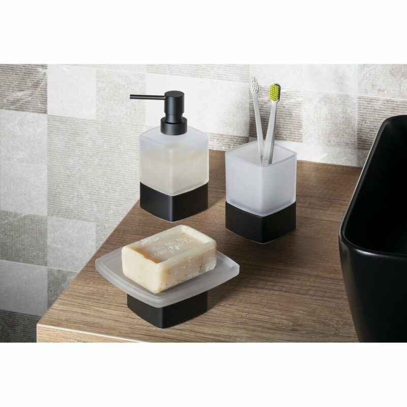 Elegantná mydlovnička v čiernom prevedení s mliečnym sklom bude ozdobou každej kúpeľne. Postavte si ju na umývadlo či vaňu.