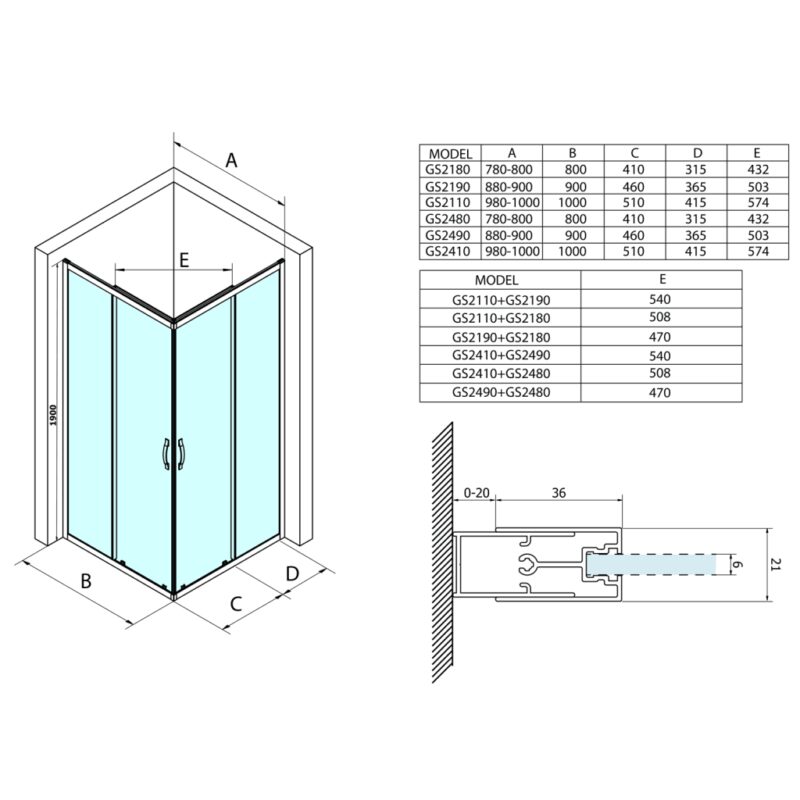 Stenový profil poskytuje nastaviteľnosť až 20 mm pre vyrovnanie nerovností.Jednoduchá fixácia zásteny ku stenovému profilu iba jedným skrutkou zabezpečuje dostatočnú stabilitu.