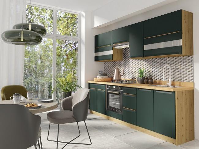 Kuchyňa GLADIOLA – GREEN 260 CM je v štýlovom a funkčnom prevedení. Je vhodná do modernej aj klasickej kuchyne.Korpus nábytku je vyrobený z kvalitnej LTD dosiek vo farbe dub Artisan, v matnom prevedení. Dvierka sú vyrobené z MDF dosky, v zelenom matnom prevedení. Nábytok je nenáročný na údržbu. Disponuje tichým dovieraním dvierok. Nožičky sú regulovateľné.Drez, pracovná doska, kuchynský sokel a spotrebiče nie sú v cene. Pracovnú dosku, sokel a drez je možné u nás dokúpiť.Skladá sa z týchto skriniek /š,v,h/Drezová skrinka 80 – 80 x 82 x 51 cmDolná kuchynská skrinka 40 – 40 x 82 x 51 cmDolná kucnykská skrinka 80 – 80 x 82 x 51 cm2 x Horná kuchynská skrinka 80 – 80 x 72 x 32 cmHorná kuchynská skrinka 40 – 40 x 72 x 32 cmHorná kuchynská skrinka 60 – 60 x 36 x 32 cm.Kuchynská skrinka na vstavanú rúru nie je v cene. V prípade záujmu je potrebné si ju dokúpiť.