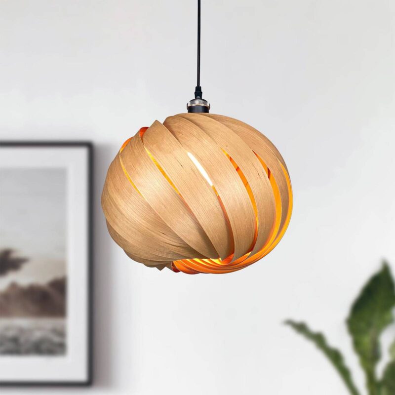 Ručne vyrobená závesná lampa Mela s tienidlom z dubovej dyhy Toto závesné svietidlo upúta pozornosť každého ešte pred zapnutím svetla. Odtieň Mela je ručne vyrobený zo starostlivo vybraných dýhových pásov svetlého duba. Tieto pásy opúšťajú telo na boku v hornej časti, potom sa špirálovito stáčajú nadol a v polkruhu sa ťahajú dovnútra. Pri pohľade zboku tvorí tento spôsob tienenia guľu. Závesné svietidlo Mela sa vďaka svojmu svetlému drevu ideálne hodí k mnohým štýlom zariadenia a možno ho použiť na základné osvetlenie v obývacích izbách a spálňach, ako aj na osvetlenie stola. Závesné svietidlo Mela je produkt, ktorý vyrobila spoločnosť Gofurnit z Kolína nad Rýnom, ktorá existuje od roku 2019, a to z hľadiska udržateľnosti, pokiaľ ide o materiál, ako aj o balenie a prepravu. – Chránené proti škodlivému slnečnému žiareniu UV lakom – čistenie je jednoduché pomocou mierne navlhčenej handričky