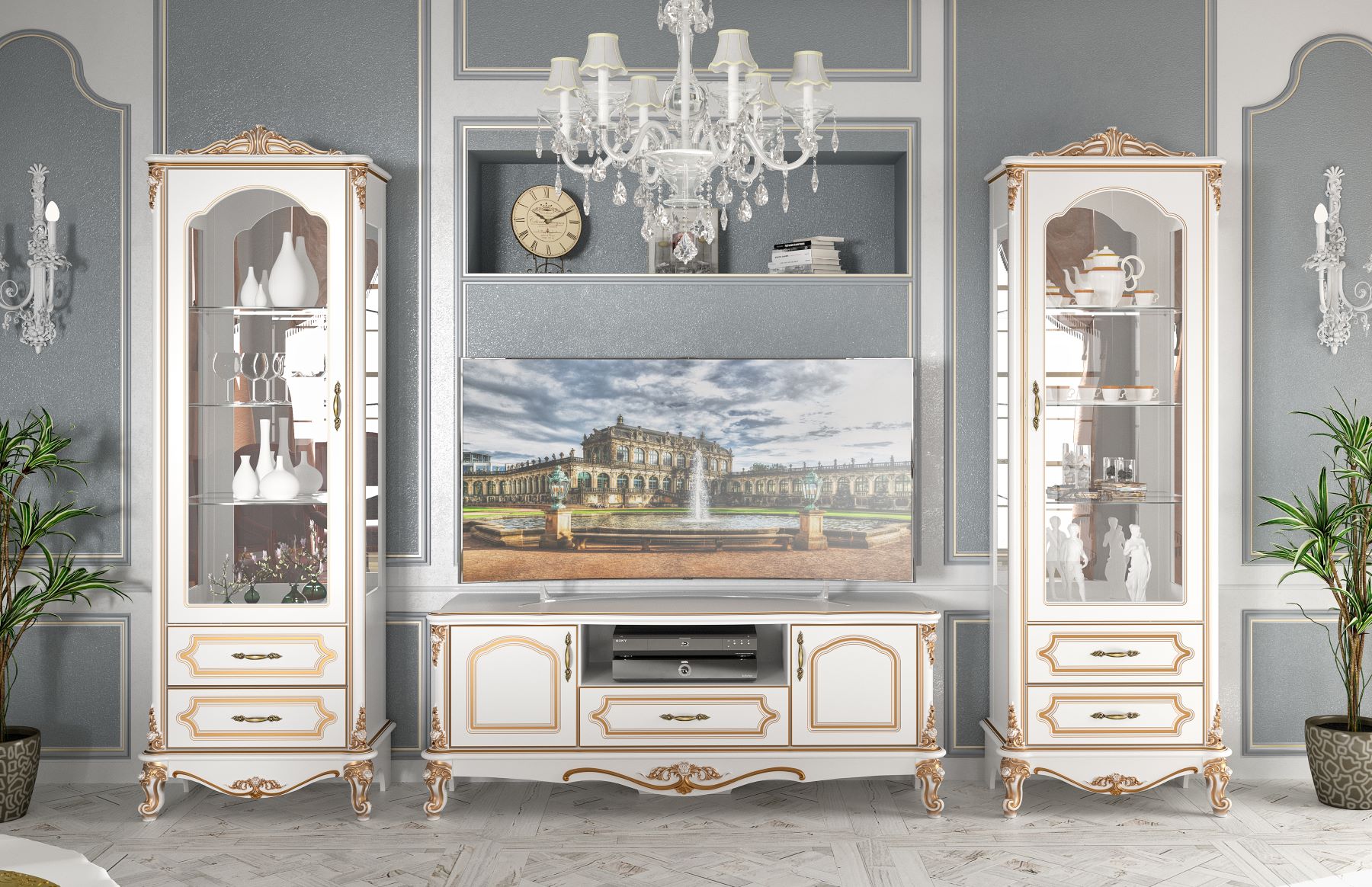 Luxusná obývacia zostava GOLDEN poteší milovníkov rustikálneho a glomour štýlu.Vytvorte si svoje vlastné kráľovstvo vďaka nádhernej kolekcii GOLDEN v bielo zlatom prevedení, ktorá je vyrobená z kvalitnej a pevnej MDF dosky. Neopakovateľný vzhľad patiny ešte zvýrazňuje štýl tohto nábytku. Kombinácia bielej farby a zlatých dekorov podčiarkuje jej rustikálny nádych. Pevné ozdobné nožičky dodávajú nábytku stabilitu.Zostava obsahuje:vitrína ľavá: (ŠxVxH): 75x 220 x 49 cmvitrína pravá: (ŠxVxH): 75x 220 x 49 cmTV stolík: (ŠxVxH): 165x 65 x 49 cm Dodávame v demonte.