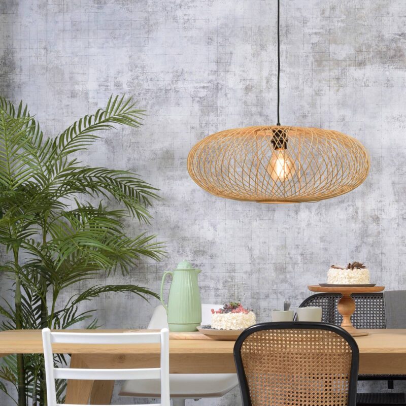 Ručne vyrobená bambusová závesná lampa Cango v eliptickom tvare Závesné svietidlo s prírodným vzhľadom, vyrobené z udržateľného materiálu a upravené do atraktívneho tvaru – to je závesné svietidlo Cango, ktoré sa vzrušujúcim spôsobom uplatní nad jedálenským stolom aj v obývacej časti. Jeho tienidlo má elipsovitý tvar a je otvorene navrhnuté podľa vzoru výpletu mnohých jemných bambusových prameňov. Moderný a jedinečný svetelný prvok, ktorý po zapnutí alebo vypnutí dodá interiéru určitý štýl. Vďaka medzerám je použitý zdroj svetla viditeľný a môže vyžarovať svetlo do všetkých strán. Týmto spôsobom sa okrem priameho osvetlenia smerom nadol dosahuje aj nepriame, atmosférické svetlo, ktoré zvýrazňuje vzory v okolí a vytvára tak harmonickú súhru svetla a tieňa. Bambus je veľmi pružný materiál, ktorý rastie veľmi rýchlo a dá sa opakovane strihať. Flexibilita sa hodí pri spracovaní – tienidlá sa tkajú ručne, pričom sa spoliehajú na tradičnú remeselnú zručnosť ľudí vo Vietname. Značka Good & Mojo sa usiluje o to, aby mal každý prístup k svetlu a aby sa chudoba znižovala aj v chudobných krajinách, a to prostredníctvom spolupráce s charitatívnymi projektmi. Napríklad vďaka spolupráci s projektmi zalesňovania Eden umožňujú dedinčanom získať prácu, ktorá uživí ich rodiny. Okrem toho za každú predanú lampu vysadia strom v krajinách, ako je Nepál, Indonézia alebo Keňa, na účely zalesňovania.