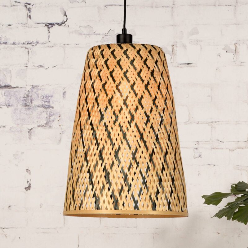 Závesné svietidlo kónického tvaru Kalimantan z bambusu Kónický tvar tienidla závesnej lampy Kalimantan vyžaruje svetlo priamo nadol cez svoj otvor. Je ručne tkaná z udržateľného, pružného bambusu, vďaka čomu je každá lampa jedinečným svetelným objektom. Vďaka účasti výrobcu Good & Mojo v charitatívnych nadáciách sa za každú predanú lampu vysadí strom na zalesňovanie v chudobných krajinách. Použitím bambusového materiálu sa pri výrobe svetiel dbá aj na nízku ekologickú stopu. Vzor prútia sa vyznačuje jemnými medzerami, ktoré zároveň umožňujú únik svetla do okolia a vytvárajú príjemné celkové osvetlenie. Do vzoru v prírodnej farbe boli zakomponované aj prvky čierneho bambusu, ktoré odtieňu dodávajú osobitý vzhľad. Kalimantan je ideálny na osvetlenie malých stolov alebo pultov, prípadne na inštaláciu viacerých svietidiel na väčšie plochy.