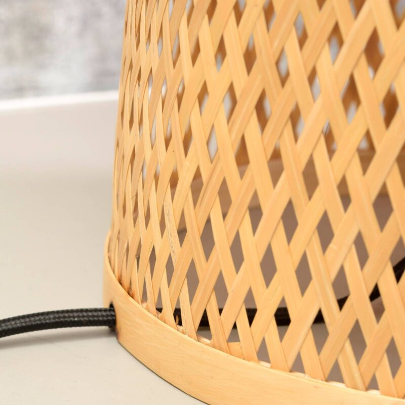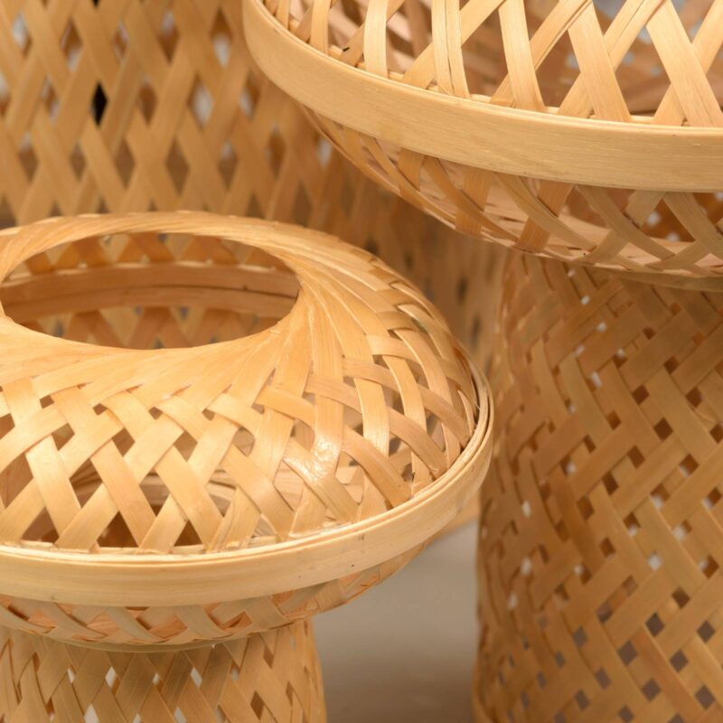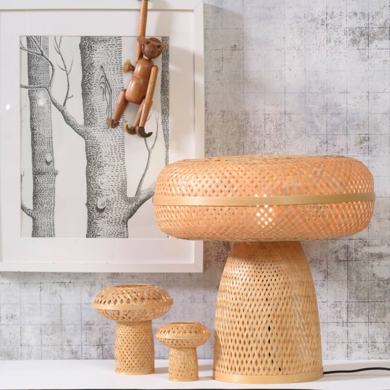 Bambusová stolová lampa Palawan v dekoratívnej sade 3 kusov Bambusová lampa v prírodnej farbe má veľmi zvláštne čaro. Vďaka svojmu prirodzenému vzhľadu a atraktívnemu dizajnu je Palawan dekoratívnym svetelným prvkom, ktorý vytvára útulnú atmosféru. Celé telo je utkané z udržateľného bambusu, veľmi rýchlo rastúcej a pružnej rastliny, ktorá presvedčí vysokou produkciou kyslíka. Podstavec je pomerne úzky a valcovitého tvaru a vnútri sa nachádza elegantný železný rám, ktorý nesie zásuvku a kábel. Ploché okrúhle tienidlo je takmer úplne uzavreté, len v hornej časti je integrovaný okrúhly vývod svetla. Stolná lampa tak vytvára nepriame svetlo, ktoré zároveň svieti dookola prostredníctvom vzoru a šíri v miestnosti atmosférický svetelný obraz. Na zvýšenie dekoratívneho efektu sa Palawan dodáva v súprave troch kusov – dve menšie figúrky rovnakého tvaru a tiež vyrobené z bambusu zdobia stolnú lampu a vytvárajú dojem malej rodiny vcelku. V roku 2016 uviedla holandská spoločnosť It’s about Romi na trh udržateľnú značku Good & Mojo. Odvtedy sa im podarilo vysadiť už viac ako 35 000 stromov, pretože za každý predaný výrobok investujú do nového stromu. Okrem toho už viac ako 6 500 rodín dostalo solárne produkty prostredníctvom darov nadácii WakaWaka. Spoločnosť sa už roky zapája do sociálnych a charitatívnych projektov, ktoré pomáhajú ľuďom a nášmu životnému prostrediu.