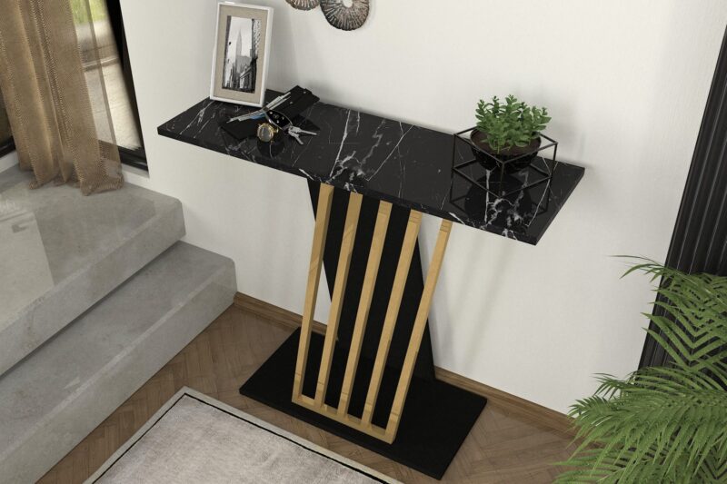 Luxusný konzolový stolík GORO v štýle art-deco vás zaiste upúta svojím jedinečným dizajnom. Vrchná doska je v čiernom lesklom farebnom prevedení imitujúcou mramor. Podstava je tvorená čiernou doskou s nohami v tvare písmena X. Celkový art-deco dizajn stolíka je doplnený zlatou farbou nohy, ktorá dokonale ladí s čiernou farbou. Konzolový stolík zaručene osvieži každý interiér a bude sa vynikajúco vynímať najmä v luxusnejšie zariadených art-deco predsieňach alebo halách. Farebné prevedenie: čierny mramor / zlatáMateriál: kvalitné 18 mm LTDRozmery: š90 x v76,8 x h29,6 cm.Dodávame v demonte
