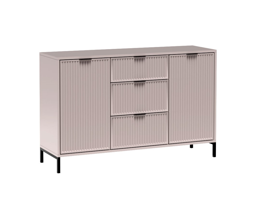 Štýlová komoda LS2 z kolekcie GRACE STYLES. Moderná komoda s 3 priestrannými zásuvkami v strede a dvoma skrinkami s policou, vďaka čomu je veľmi funkčná. Zmestí sa do nej veľa oblečenia, doplnkov a dokumentov. Jej používanie je veľmi jednoduché a príjemné.Rozmery: 135 x 86 x 40,6 cm.Dostupné v jednej z dvoch farieb: kašmír alebo indigoVlastnosti produktu:doska – 18mm laminovaná nábytková doskapredná strana – 18mm MDF doskahrana – ABS dyhazadná strana – HDF doskarukoväte – kovovépánty – kovové s mechanizmom tichého zatváranianohy – čierny kov – výška 12 cmKolekcia nábytku GRACE STYLES je dostupná v dvoch farbách a je len na vás, ktorú si vyberiete. Či už je to prírodná teplá kašmírová farba, ktorá je elegantná a hodí sa do každého interiéru, alebo výraznejšia indigo farba s úchytkami v medenej farbe. Nábytok je zdobený vzorom na čelách v podobe frézovaných drážok. Všetok nábytok z tejto kolekcie je na čiernych kovových nožičkách.Sektor GRACE STYLES v sebe spája štýly v interiéri.Jednoduché a funkčné tvary sa budú dobre hodiť do obývačky, spálne aj jedálne.Moderné farby, ktoré sú aktuálnym hitom pri tvorbe dizajnov v nových domácnostiach.Kovové, čierne nohy dodávajú miestnostiam ľahkosť a priestor.Nábytok dodávame v demonte.
