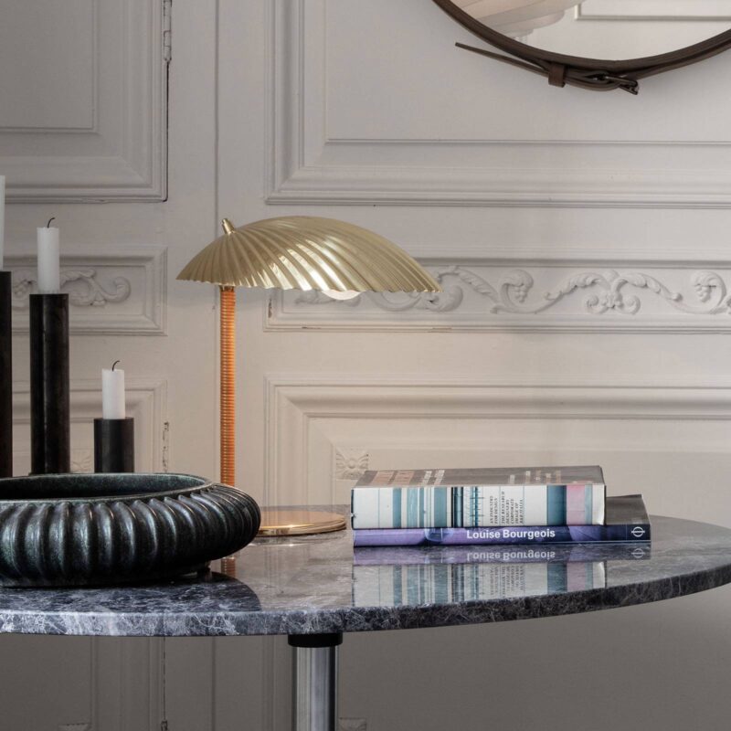 Dizajnová stolná lampa 5321 s mosadzným tienidlo na lampu v tvare mušle Fínsky dizajnér Paavo Tynell (1890 – 1973) sa pre svoje výtvory často inšpiroval rozmanitosťou prírody a dal minimalistickým moderným výtvorom nádych hravej prírody a romantizmu. To je zrejmé aj u tejto extravagantnej stolovej lampy. Jej tienidlo na lampu je modelovaný na mušle, v ktorej použitá lampa preberá úlohu mušľovej perly. Ratanová tyč je ďalším prírodným detailom. Dizajn stolovej lampy 5321 sa datuje do roku 1938. Okrem útulného prídavného svetla z nej stolová lampa vyžaruje aj neporovnateľný vkus elegancie a presviedča svojím bezchybným prevedením, ktoré charakterizuje výrobky dánskeho výrobcu Gubi . Paavo Tynell – vyštudovaný kováč a vyštudovaný remeselník – založil v roku 1918 kovospracujúcu a svetelnú spoločnosť Oy Taito AB s Emilom Wickströmom, Ericom Ehrströmom, Fransom Nykänenom a Göstou Serlachius. V prvých rokoch vyrábali kovové výrobky pre interiér i exteriér, napríklad sochy a príbory, až potom začali v 30. rokoch 20. storočia vyrábať svetlá. Tynell, ktorý bol generálnym riaditeľom a hlavným dizajnérom spoločnosti Oy Taito až do svojho odchodu do dôchodku v roku 1953, pracoval aj pre Alvara Aalta a Aarne Ervi, ktorí pre mnohé z jeho projektov používali dizajnové produkty spoločnosti Tynell.