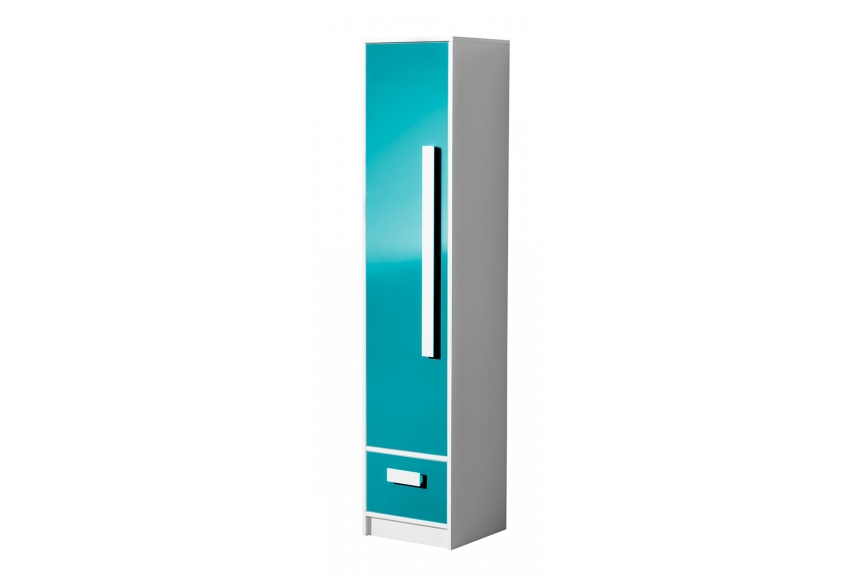 Jednodverová skriňa Guliano G4 patrí do zaujímavej rady nábytku GULIANO, ktorá sa vyznačuje nápaditým dizajnom s výraznými úchytkami. Skriňa je vyrobená z kvalitnej LTD dosky.Korpus je vždy v bielej farbe. Farba dvierok – tyrkysová.Skriňa má vo vnútri 3 police. V dolnej časti je zásuvka.Rozmery v/š/h 191/40/40 cm.GULIANO je veselý nábytok, kde si môžete vyberať z viacerých prvkov a vytvoriť si tak úžasný hravý nábytok do každej detskej, či študentskej izby.