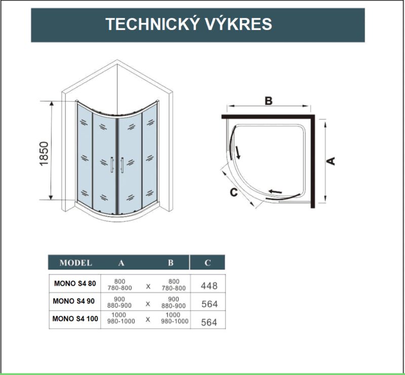 H K – Štvrťkruhová sprchová zástena MONO S4 90 číre sklo, R550 SE-MONOS490